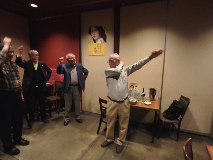 宴たけなわの中、8時30分頃には会計報告と精算を済ませ、諸江座長の指揮により応援歌・校歌を歌い、集合写真を撮って終了となりました。