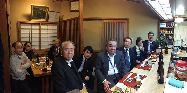 第2部 割烹さかもと(21:00~23:00) 柳岡さん行きつけのお店を貸し切り。9名で一杯の店を丁度9名。 とても良い店です。ボードに書かれたメニューに金額が出ていない…。 客との信頼関係で成り立っている様子。 甲府出身のご主人とアルバイトの女子(早稲田大学文学部3年生)が 切り盛り。彼女は卒業後は文化服装学院に行って勉強したいとのこと。 美味しいお酒と魚料理を堪能しました。 当日参加予定も、現役らしく仕事でこれない人、はやっている風邪や インフルエンザで断念された方がおられました。残念。 (堀 裕一 記)