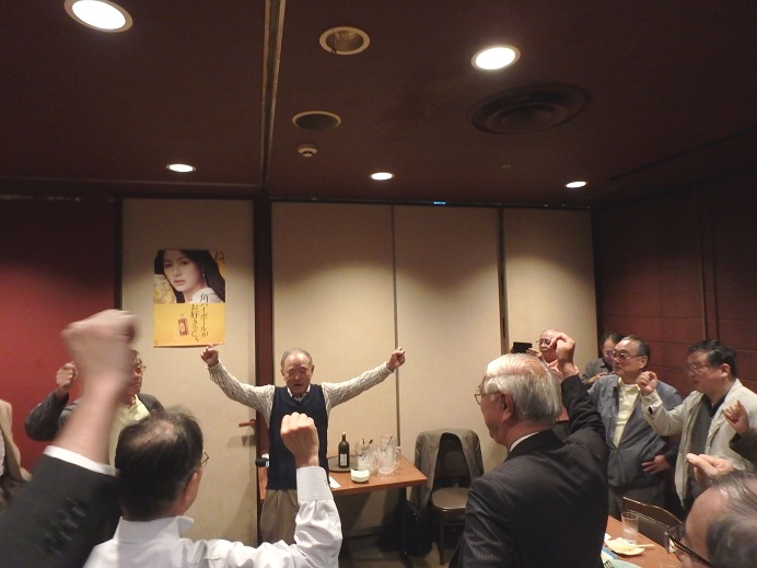 6時半を過ぎた頃、「心臓のペースメーカー交換手術から、悪運強く、見事に生還された座長による挨拶と乾杯の音頭を!」、と言う世話人からの厳しい催促に応え、諸江座長のいつもより、しっかりと長いスピーチが始まりました。