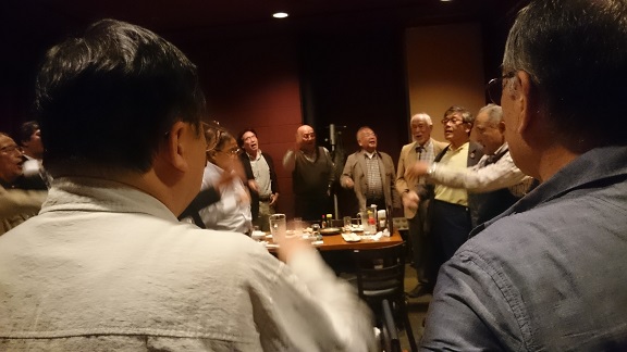 時を忘れて、楽しく歓談を続けましたが、8時半には会計を済ませ、諸江さんの指揮により応援歌、校歌を元気良く斉唱、鈴木徹さんのカメラで集合写真を撮影して散会となりました。 以上   (馬場正彦記)