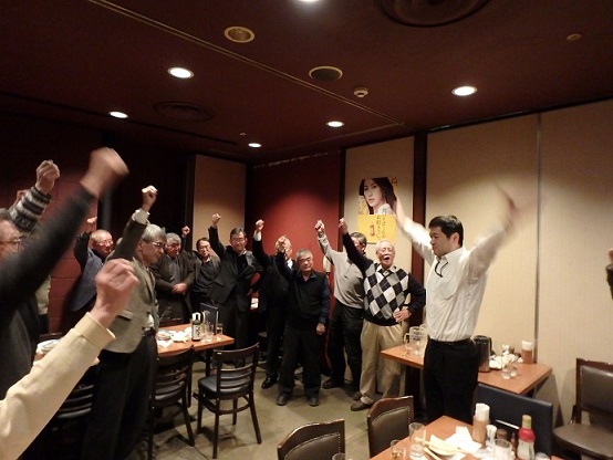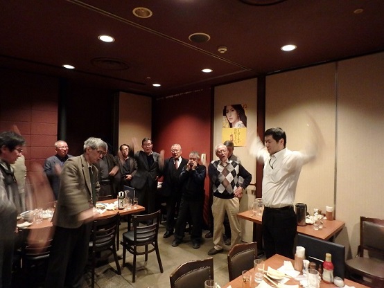 2018年2月21日、いつもの戎ビアホールでの例会、定刻の18:00になる前から早々と多くの定例メンバーが奥の個室で飲み始めている。 折しも、韓国/平昌での冬季オリンピックが激しい終盤戦に差し掛っており、各種目で活躍している日本代表選手の話題に事欠かない。定刻を過ぎても、皆夫々に賑やかな歓談が続き、座長の音頭により皆で乾杯したのは19:00を過ぎた頃であった。 乾杯に続き、今回初参加の栗林隆さんに自己紹介をして頂く。同氏は、中山美代子さんの紹介でしたが、何と筆者(片岡)とは52年振りの再会で、お互い感無量。三鷹在住なるも武蔵野稲門会への入会を希望されました。 続いて、学生時代からフィギュアスケートに親しみ、以後長年コーチや審判員をされてきた前述の中山女史、丁度平昌から帰国したばかり、とのことで、現地の状況報告をして頂く。 また、半年前から体調不良で欠席され、今回久しぶりにて元気に参加された菊池久成さんにショートスピーチをして頂く。 自由闊闥、談論風発、議論沸騰、皆其々に小さな輪を作り際限なく会話が弾み、気が付いてみれば終宴近い20:30、遅れてきた数名を含め参加者は総勢23名、会計を済ませると皆待ってましたとばかり、若手の野本好朗さんの指揮にて元気よく応援歌と校歌を歌い、最後に全員の集合写真を撮って賑やかな会を締めくくった。  (片岡冬里  記; 鈴木徹 写真)