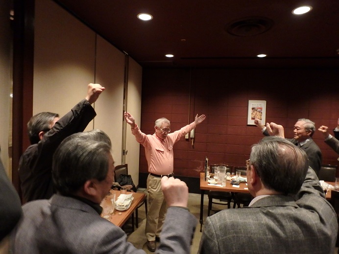 自由闊闥、談論風発、皆其々に小さな輪を作り際限なく会話が弾み、気が付いてみれば終宴近い20:30、遅れてきた数名を含め定例メンバーは総勢19名、会計を済ませると誰言うともなく、全体写真を撮り、最後は諸江座長の指揮にて元気よく校歌を歌い、和やかな会を締めくくった。