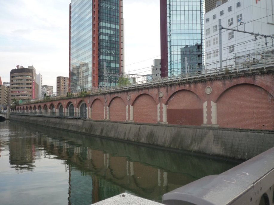 神田川に映える赤煉瓦街、最近建てられた近代的なビルも呼応して粋な赤煉瓦風 の柱。
