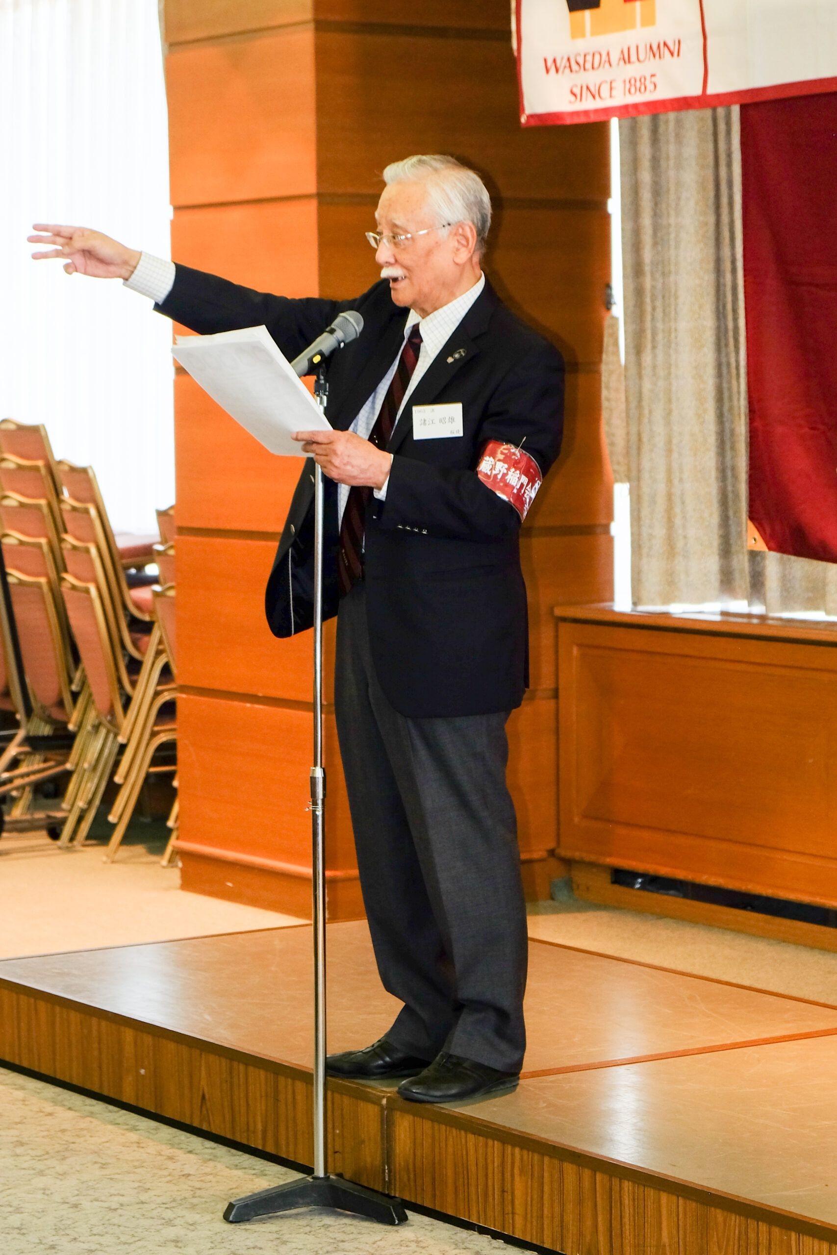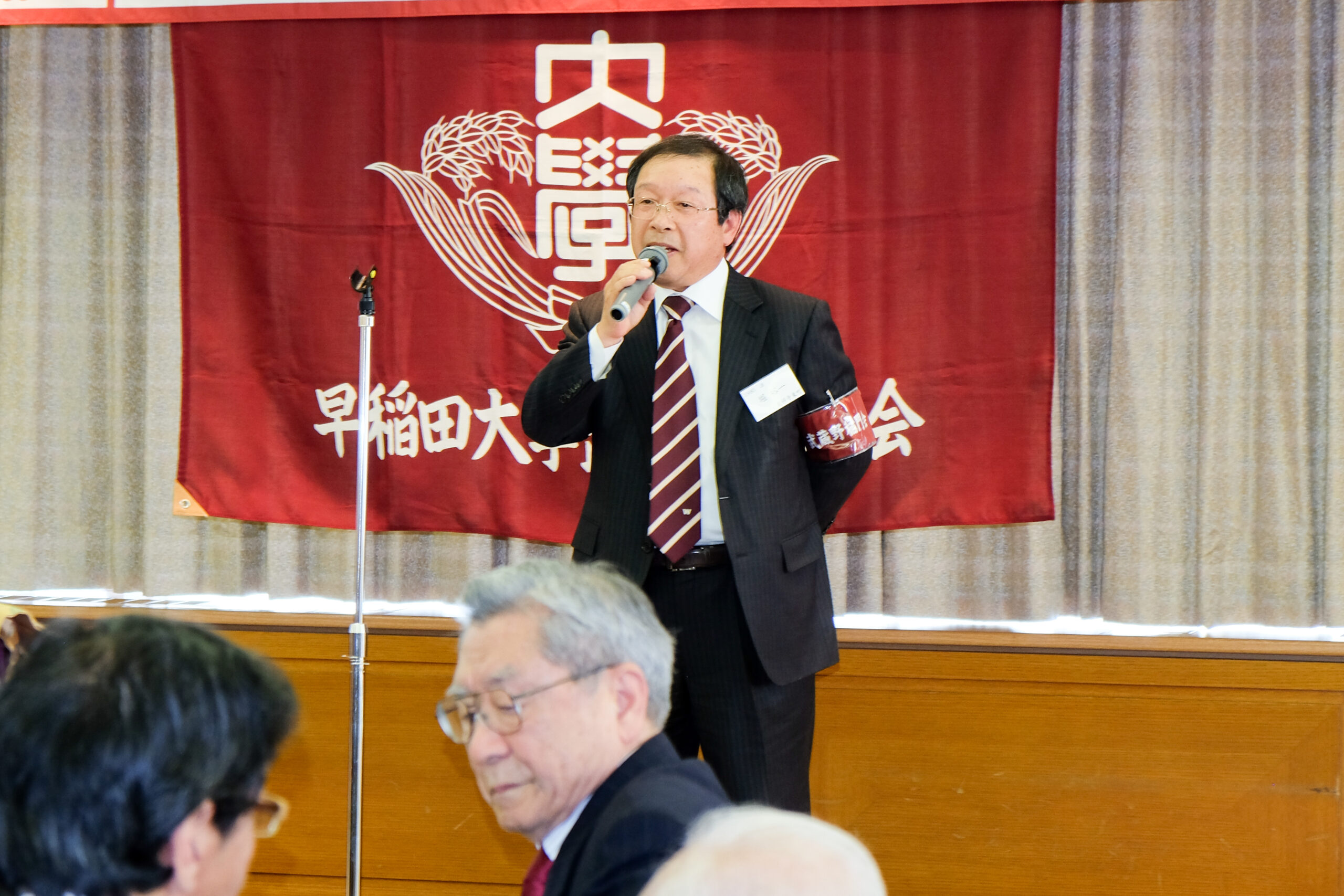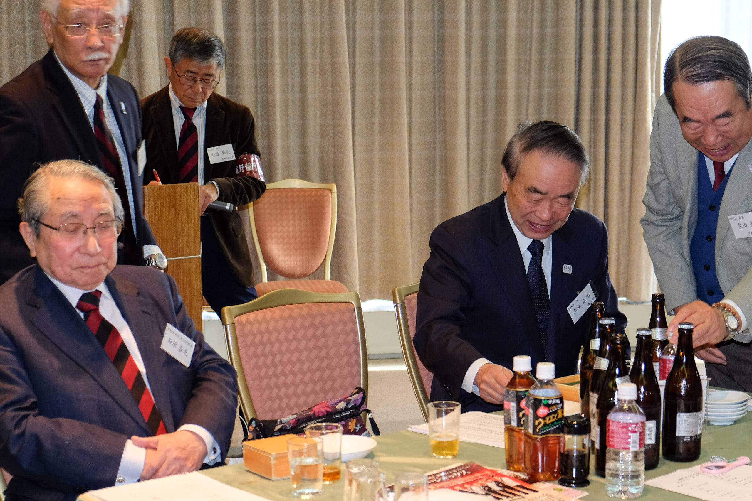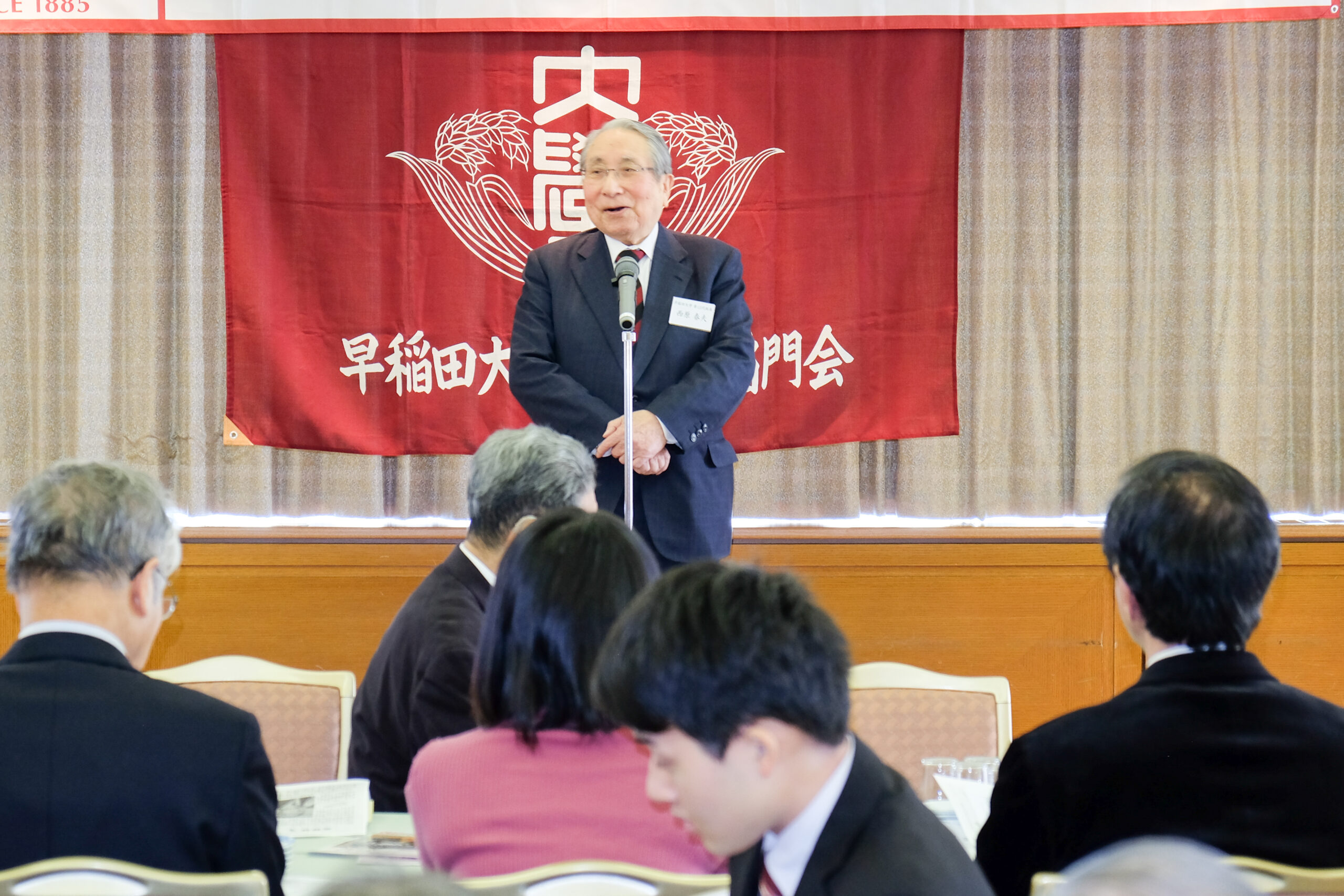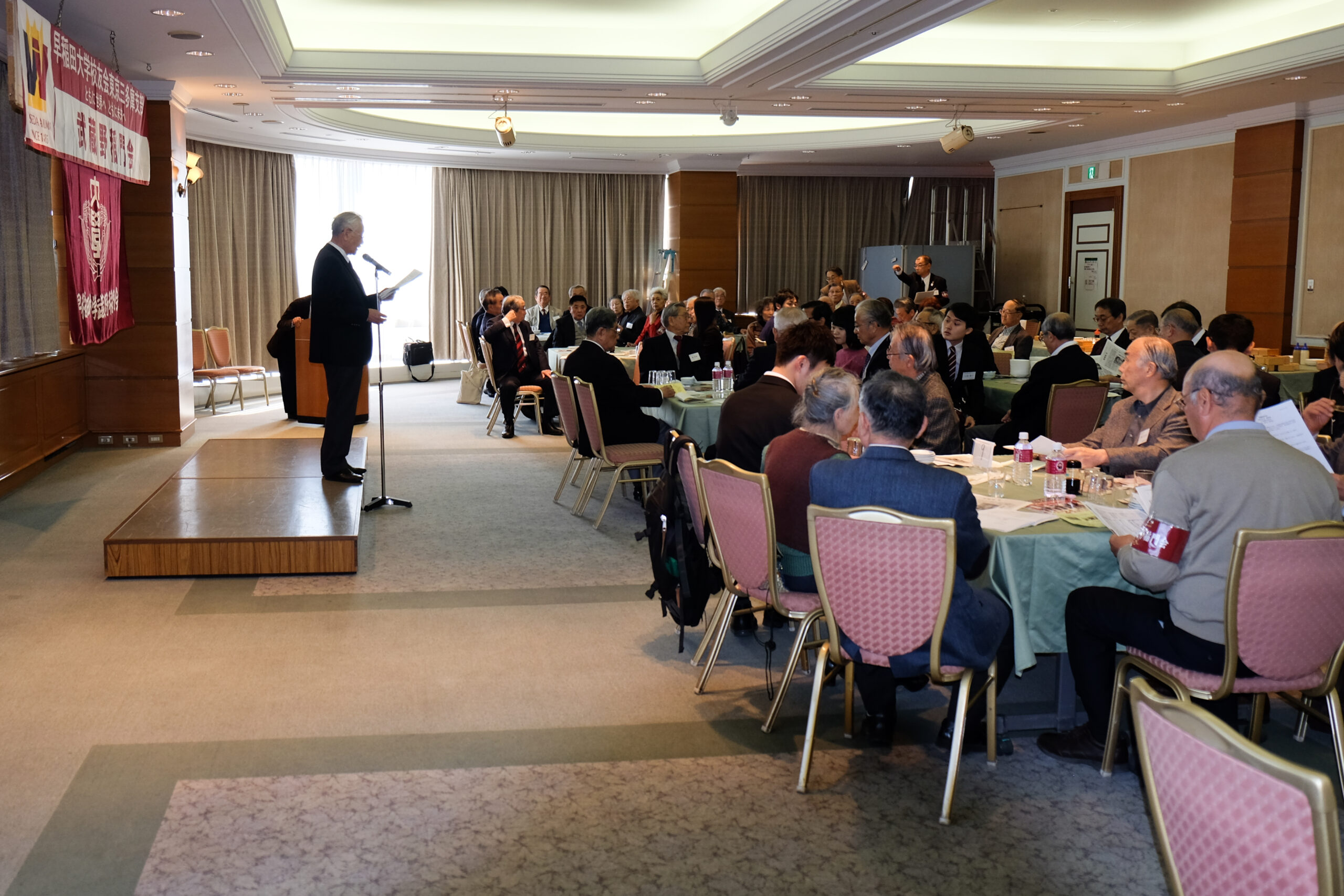 その後、名誉会員である西原春夫元総長より「新春のお話」を頂きました。人生百年と言われるようになった今日、どんな気構えで生きていくのが良いのかを、人の一生を駅伝に例えて、60歳までの往路、60歳以後がいよいよ復路であるというお話は、ユーモアと含蓄に富んだもので、出席者一同を大いに励ますものでした。