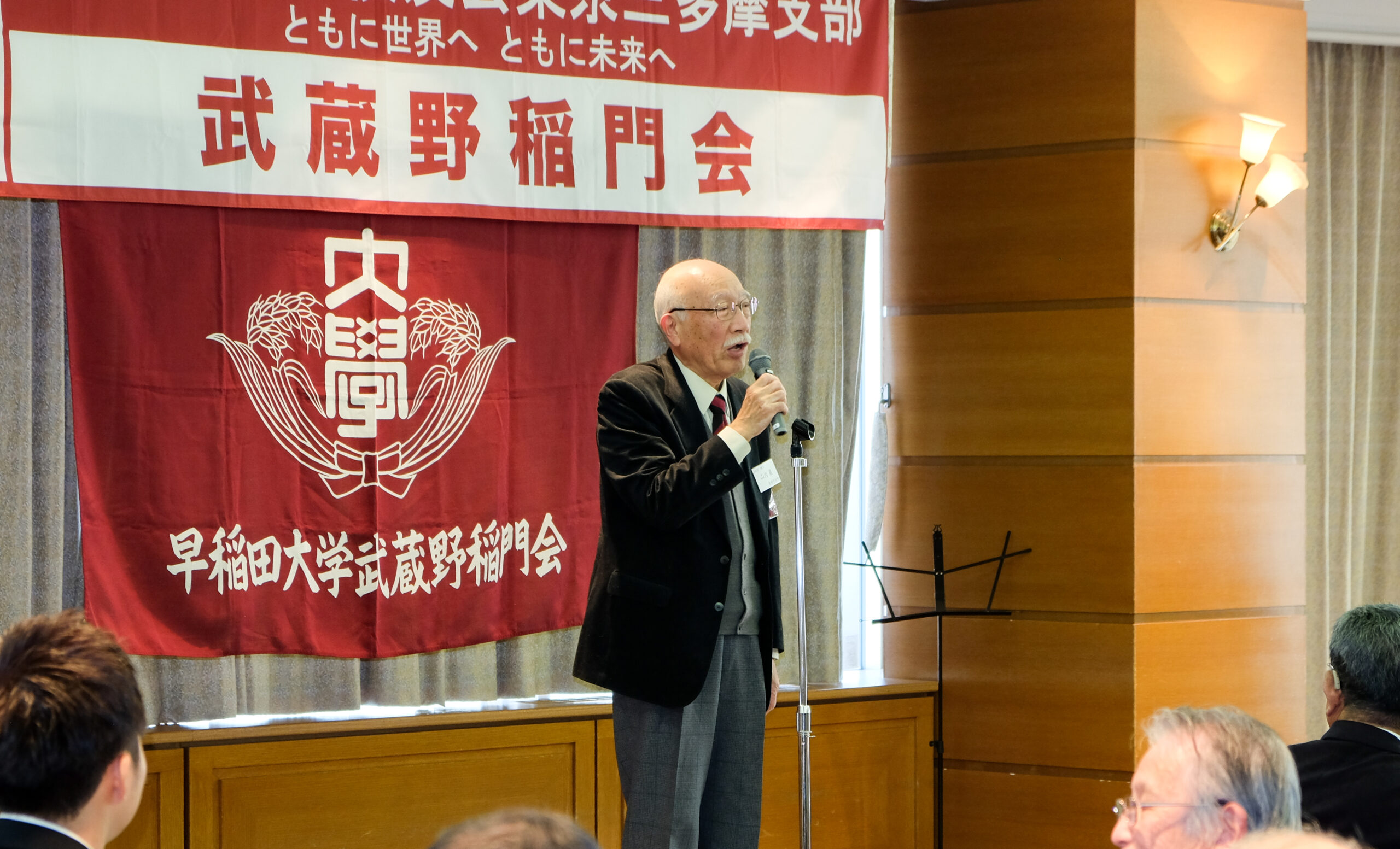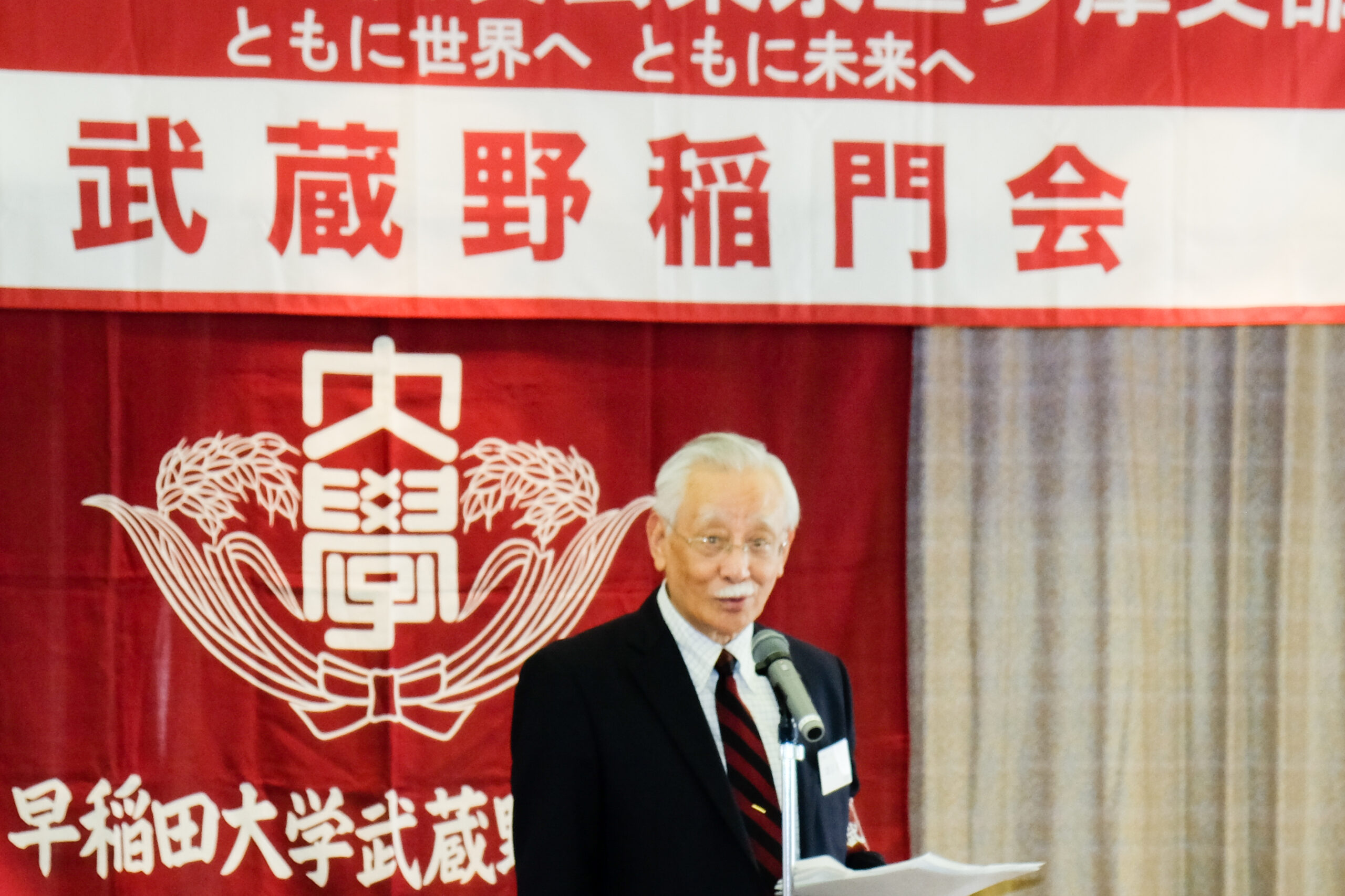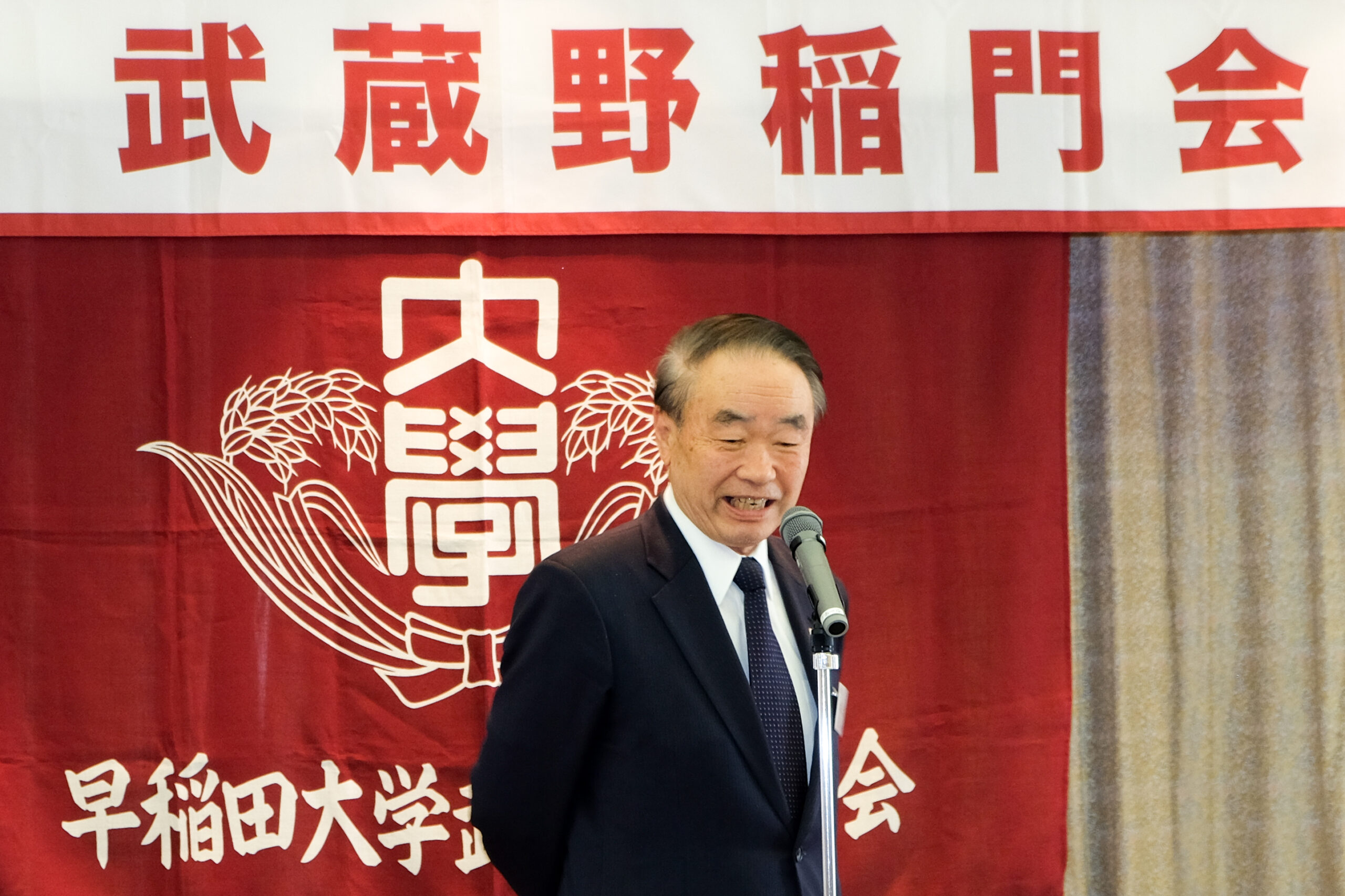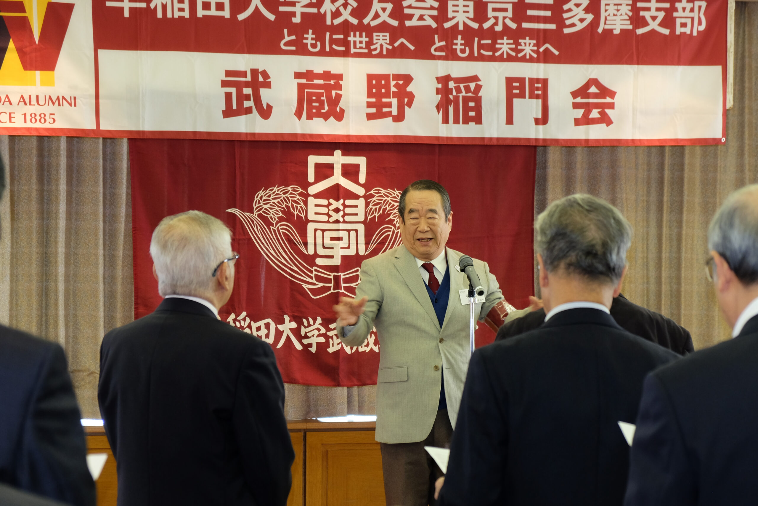 その後、名誉会員である西原春夫元総長より「新春のお話」を頂きました。人生百年と言われるようになった今日、どんな気構えで生きていくのが良いのかを、人の一生を駅伝に例えて、60歳までの往路、60歳以後がいよいよ復路であるというお話は、ユーモアと含蓄に富んだもので、出席者一同を大いに励ますものでした。