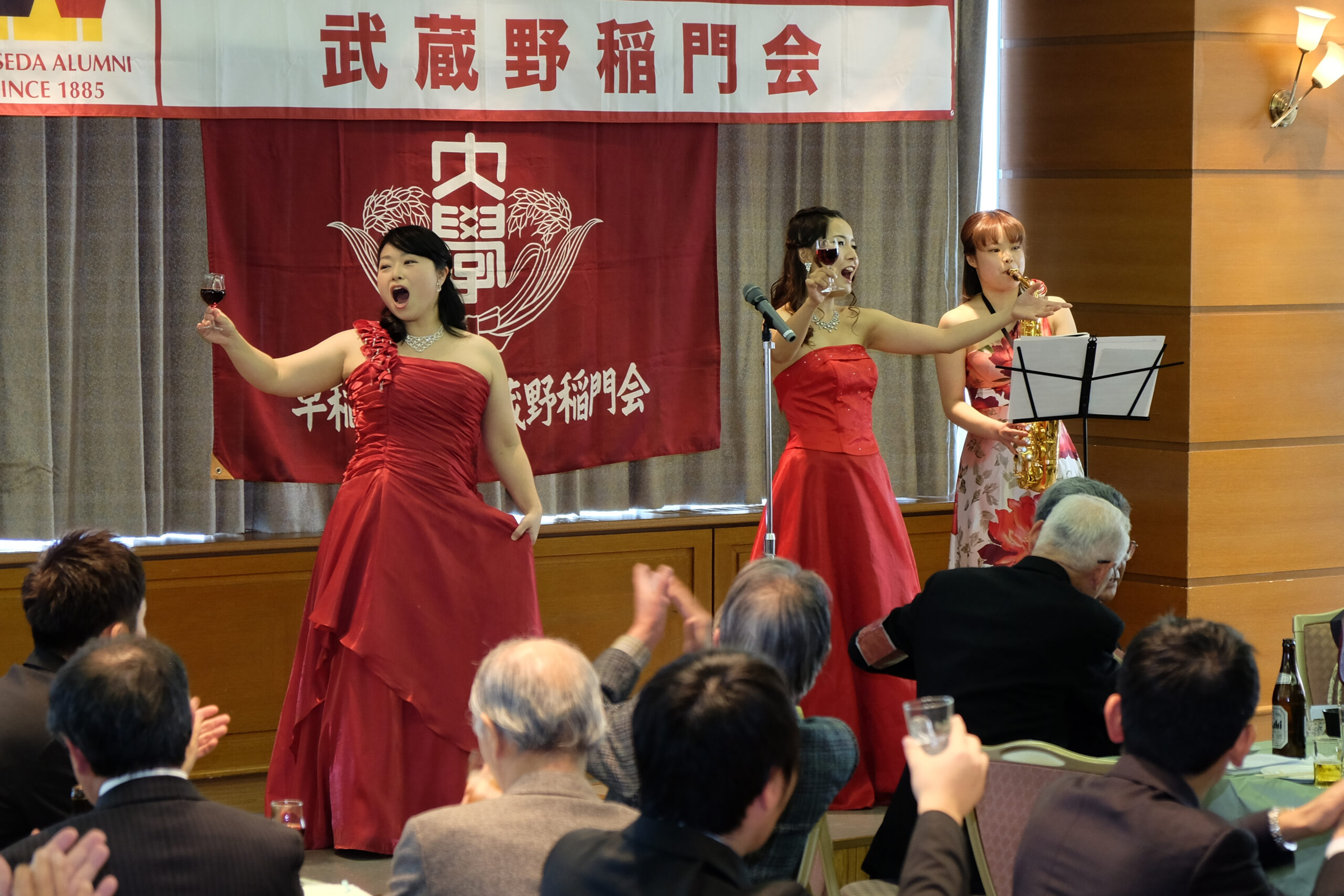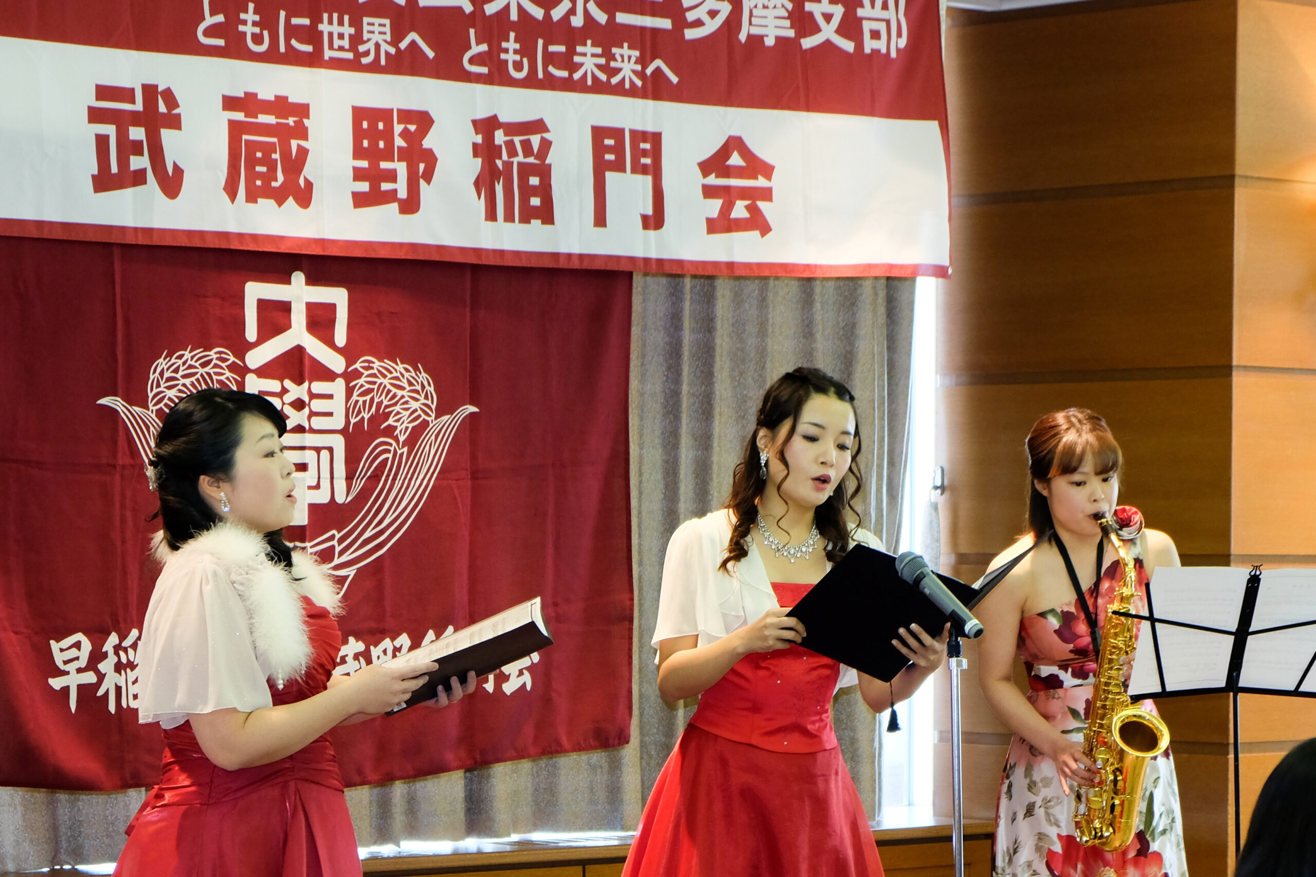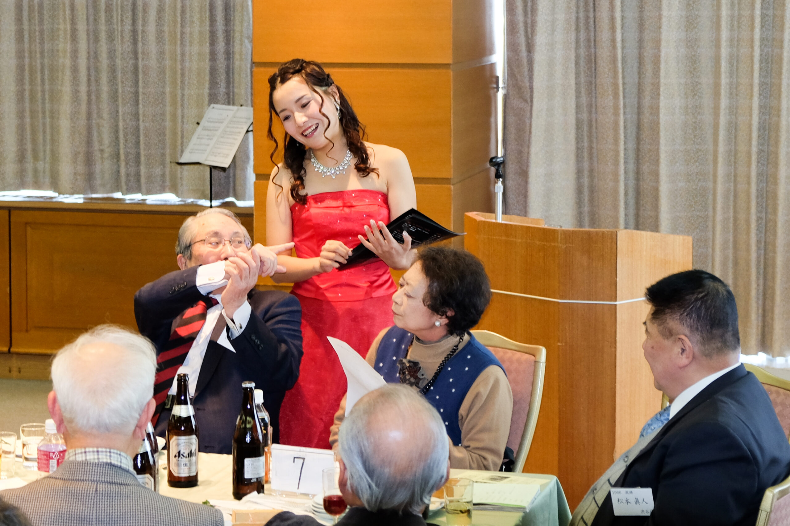 アトラクションとして、今年は、声楽家の大音絵莉、小林あいり、田中佳代子さんが登場、小林さんのサキソフォンを伴奏に、オペラの名曲「乾杯の歌」(「椿姫」より)や、唱歌「早春賦」から、「リンゴの唄」などの流行歌に至るまで、会場に響き渡る見事な歌唱が次々に続き、参加者は、その歌声に圧倒され大いに満喫しました。会場からのアンコールの声の連続にも応えていただきました。