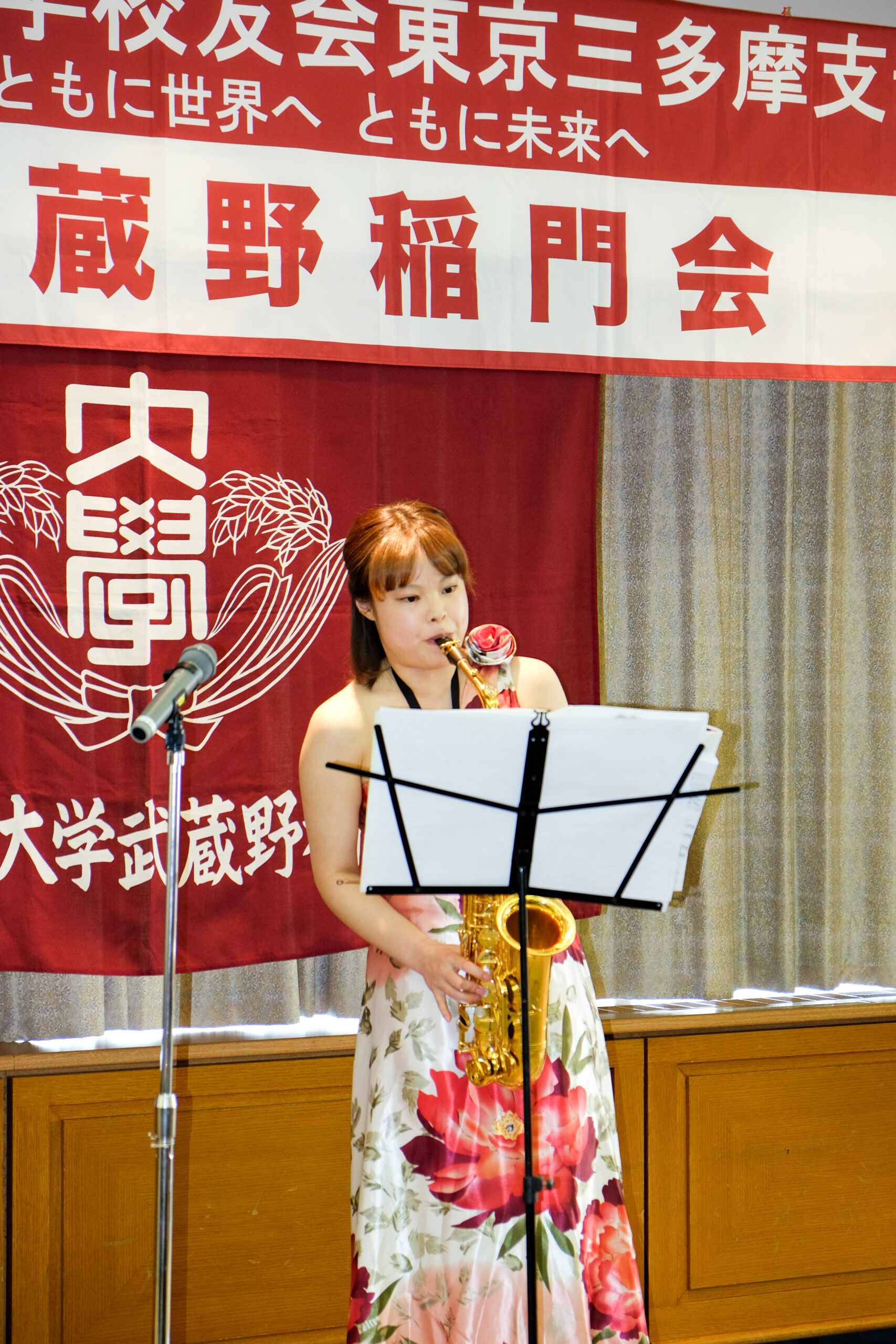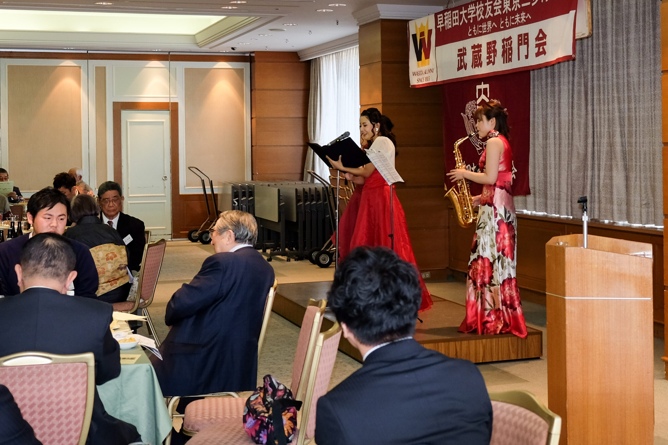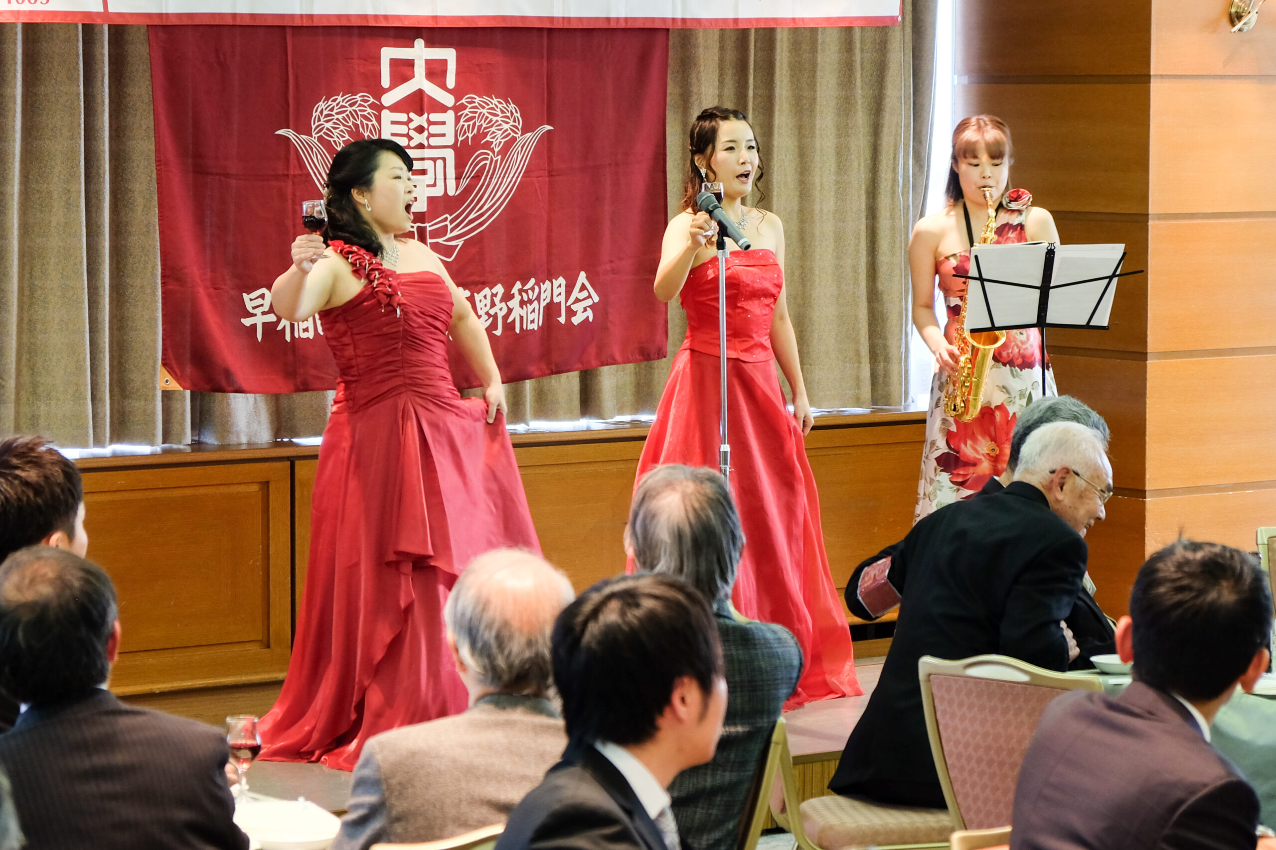 アトラクションとして、今年は、声楽家の大音絵莉、小林あいり、田中佳代子さんが登場、小林さんのサキソフォンを伴奏に、オペラの名曲「乾杯の歌」(「椿姫」より)や、唱歌「早春賦」から、「リンゴの唄」などの流行歌に至るまで、会場に響き渡る見事な歌唱が次々に続き、参加者は、その歌声に圧倒され大いに満喫しました。会場からのアンコールの声の連続にも応えていただきました。