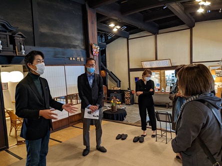 小淵沢駅から、予約していたジャンボタクシーに乗り、甲州街道に入ると七賢はすぐだ。今回のツアーは諸江さん、鈴木康之さん、谷中さんと4人が参加。現地では、13代目の対馬社長が出迎えてくれる。