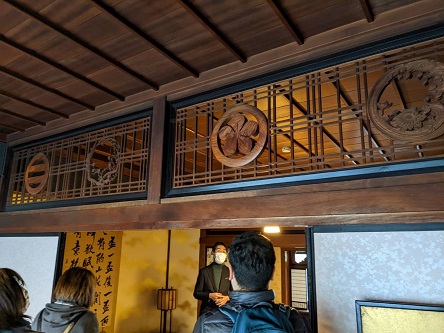 まず、七賢の歴史を聞く。信州高遠から江戸に出る途上、白州の水に惚れ込み、分家を出したのが270年前、今の七賢だ。母屋に上がり、明治天皇が一泊された行在所を見学する。立川一門の手による竹林の七賢人の欄間を見る。七賢が命名された所以だ。明治天皇は日本酒好きだったらしく、七賢をたくさん召し上がったらしい。