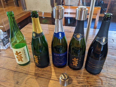 ランチは、七賢直営レストラン臺眠で、社長のお薦めのスパークリング日本酒を味わいながら愉しんだ。最初に、「山ノ霞」、オリを残した薄濁りで、麹の甘味と酸味、吟醸香を感じられる乾杯に向く一杯だ。次に「アランデュカス」。同氏とコラボした、サクランボのニュアンスをもつ辛口の一杯。さらに「杜ノ奏」、サントリー白州のウイスキー樽に寝かせた一品で辛口で、臺眠の甲州豚の塩麹つけ焼との相性もよい。日本酒も「天鵞絨(ビロード)の味」。純米吟醸、地元の酒米・夢山水を使った七賢の羅針盤といえる。白州の水を活かした酒造りで、新たな高みにチャレンジ中という。酒蔵限定販売の純米系生酒「七賢人シリーズ」など思い思いの土産を求め、家路についた。