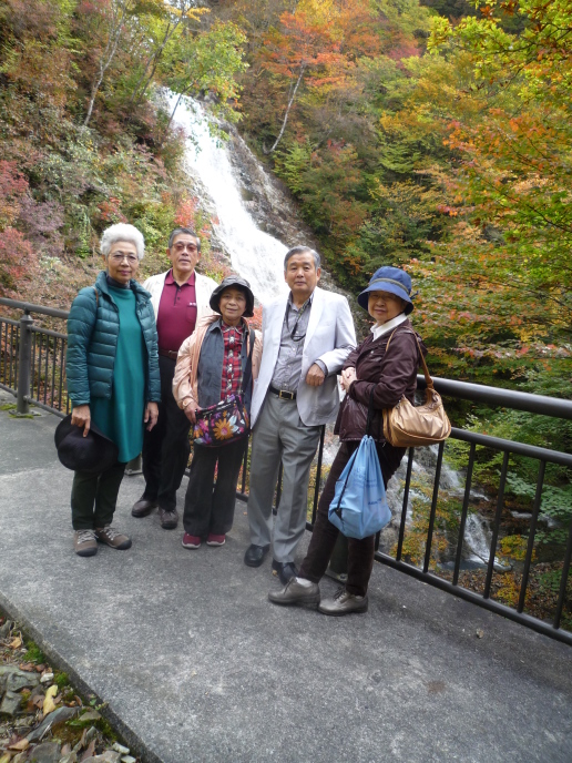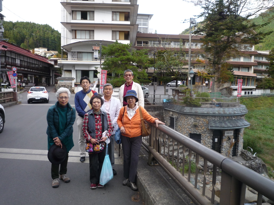 「温泉と景観を楽しむ会」は10月21日、22日で群馬県の四万温泉に行ってきました。泊った宿は老舗の名湯「田むら」(秋本澄子先輩のお勧めの宿です)。茅葺の堂々たる本館、10万坪の広い敷地を持ちその中には滝が5つ、遊歩道も整備されていました。今回の参加者は6名。特急草津号に乗って昼頃に中之条に着き路線バスに40分程乗って四万温泉に到着。山の中のひなびた温泉宿を想像していたのですが、ホテルと宿がたくさんあり、結構大きな温泉街でした。私は遊歩道を歩きたかったのですが旅館の人が冬眠前のクマが出る、ヘビも出て巻きつかれる、という事でしたので、あきらめて皆で日向見川に沿って1時間半程ウォーキング、途中足湯にも浸かりました。ちょっと残念だったのは今年は暖かくて紅葉には少し早かったことでした。旅館「田むら」は館内もとても広く趣の異なる6か所のお風呂(うち一つは混浴)がありお湯は食塩泉(ナトリウム、カルシュウム等)湯出量は毎分1600リットルも出る。バブル期に増設をしたのか廊下はくねくねと曲がっていて風呂場や食堂に行くのに一人では迷いそうで怖いくらいでした。