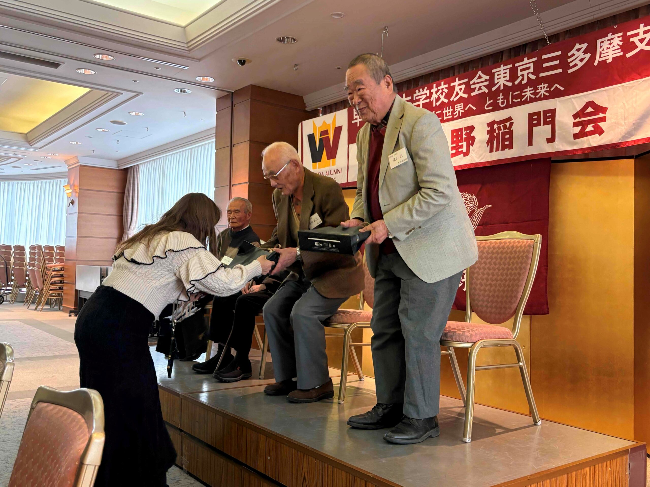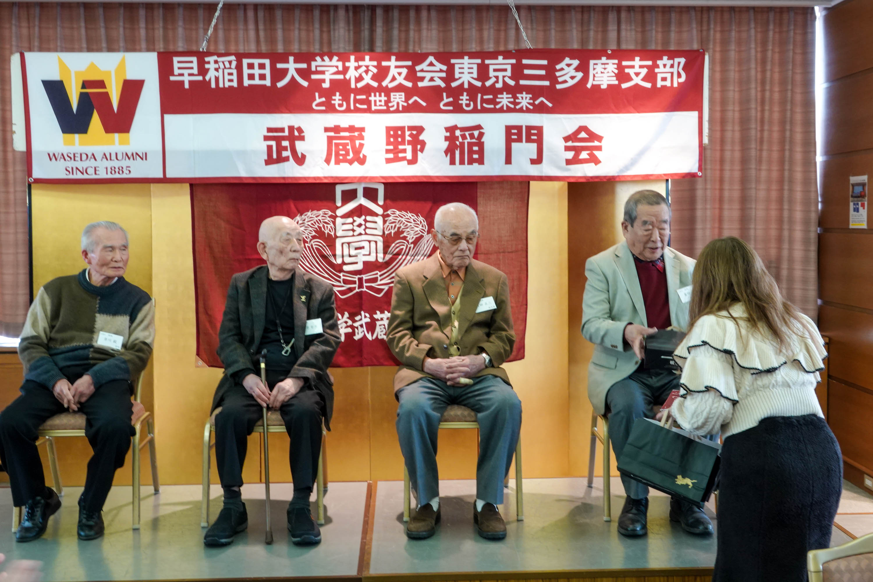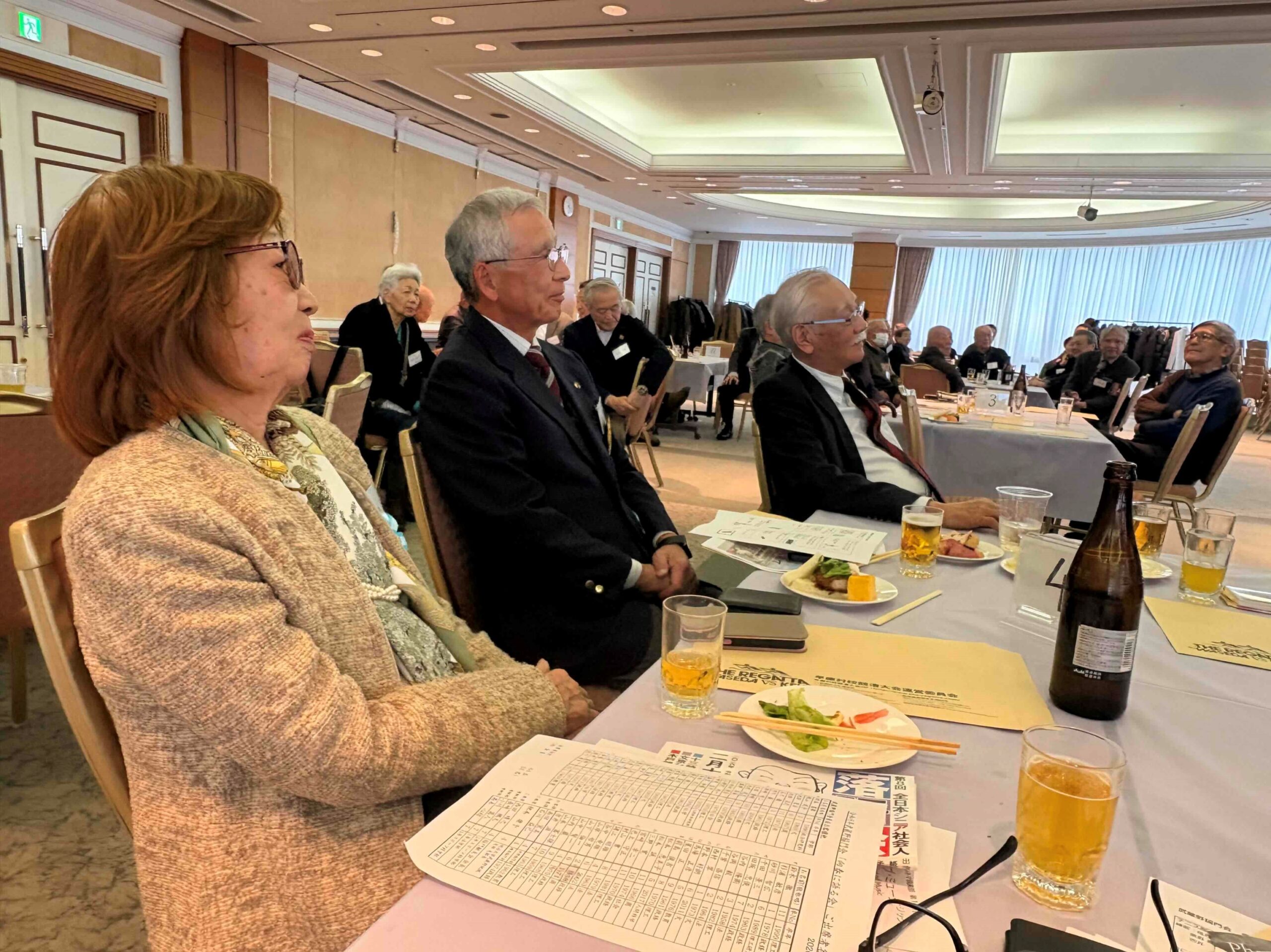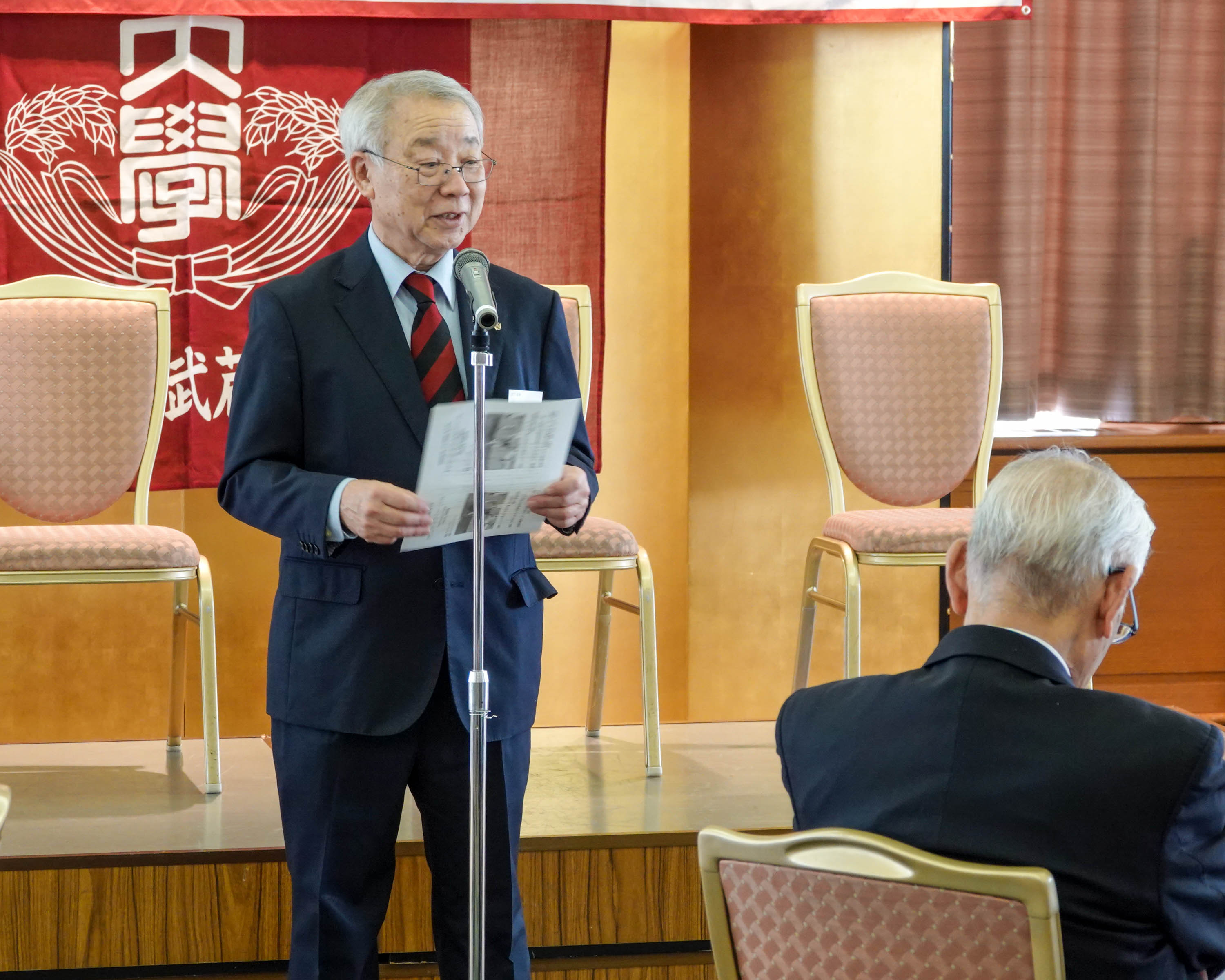 谷中常任幹事(2002 ・ 法)と松本恵美子常任幹事(2017 ・ 人間科学)が司会を務め、山中会長(1975・政経)の挨拶に続き、卒寿を迎えた4名の会員、山岸哲男さん(1958・政経)、星田正さん(1961・政経)、市川毅さん(1961・政経)、角田正三さん(1963・政経)の紹介と記念品贈呈が行われました。
