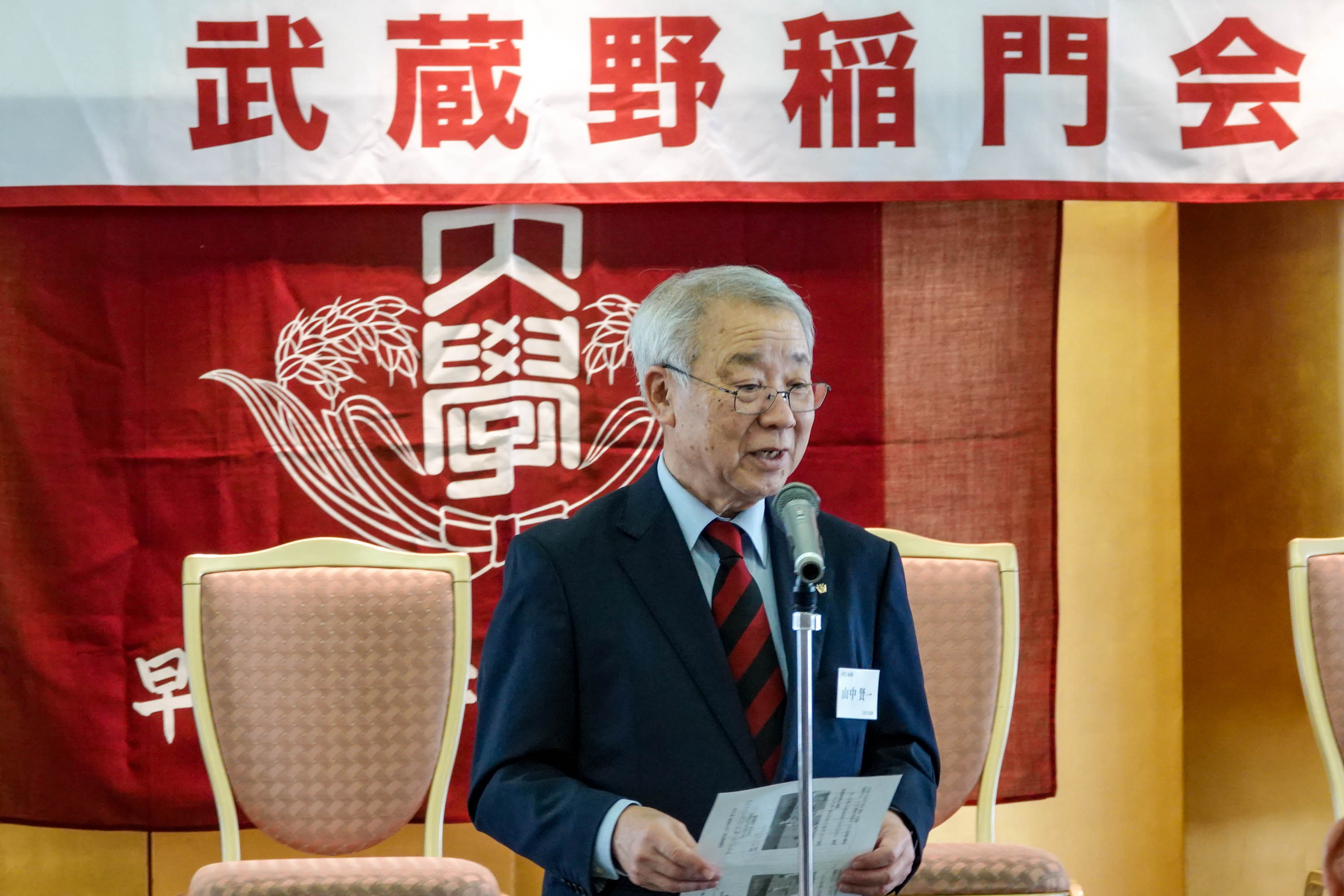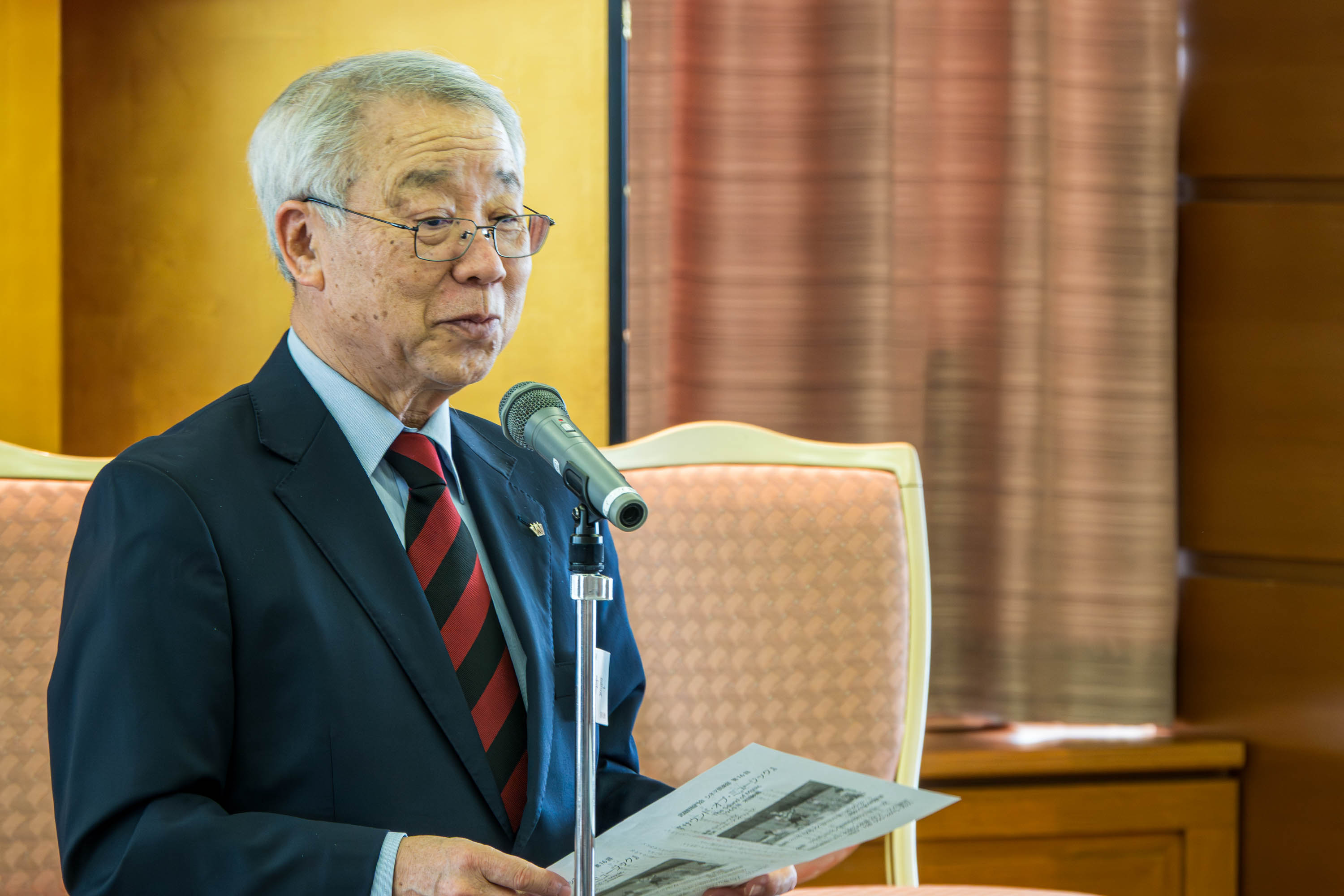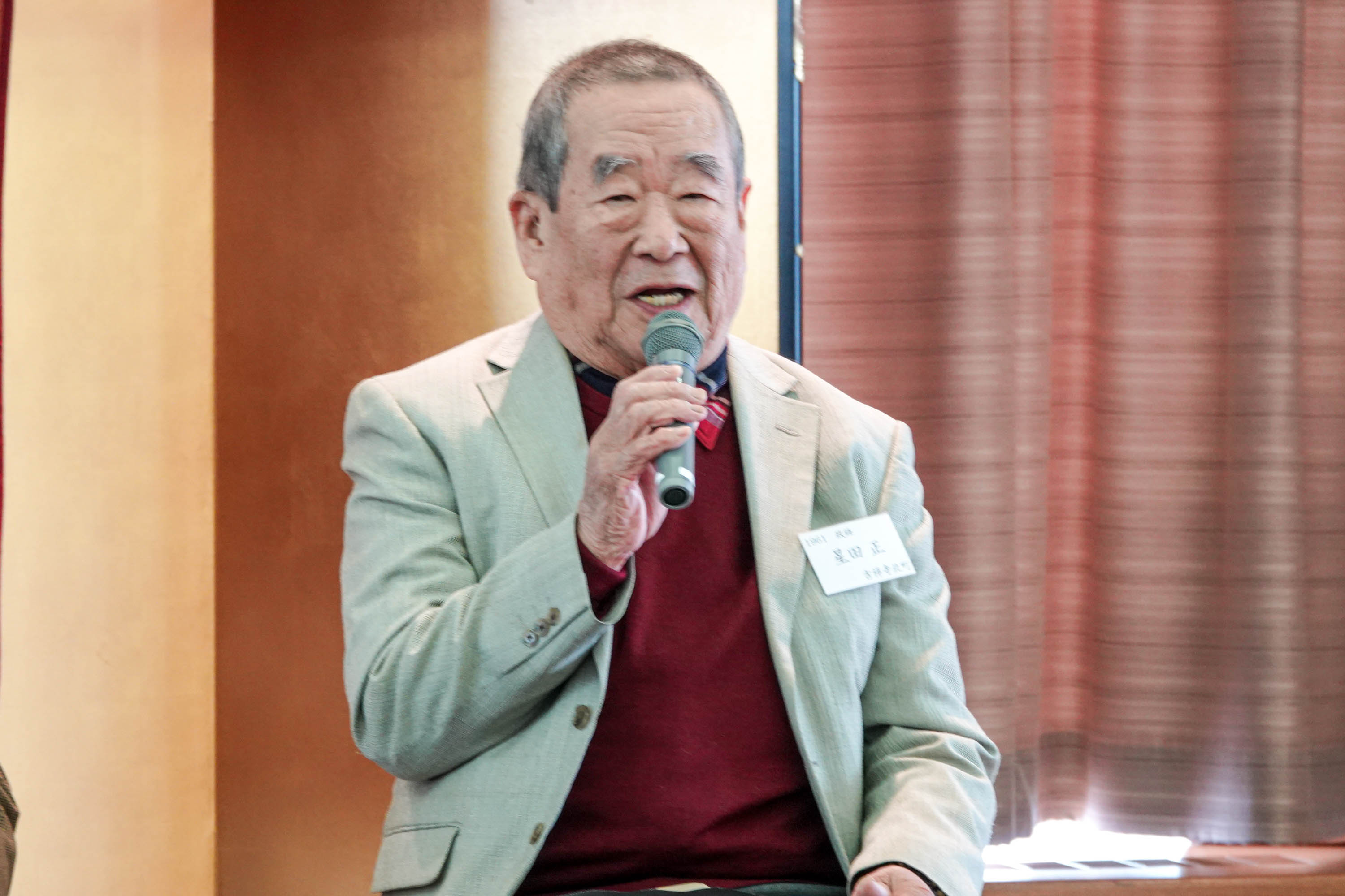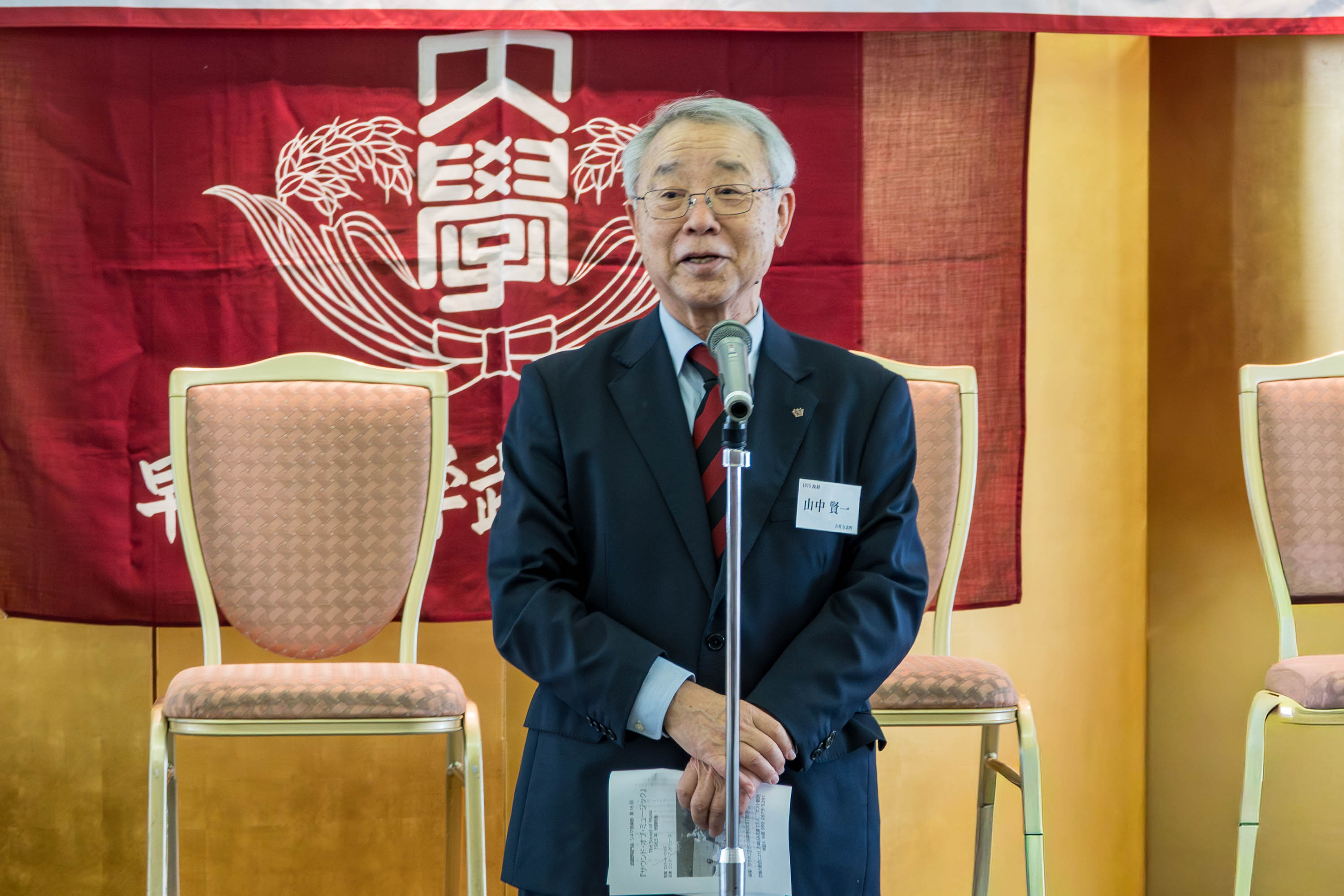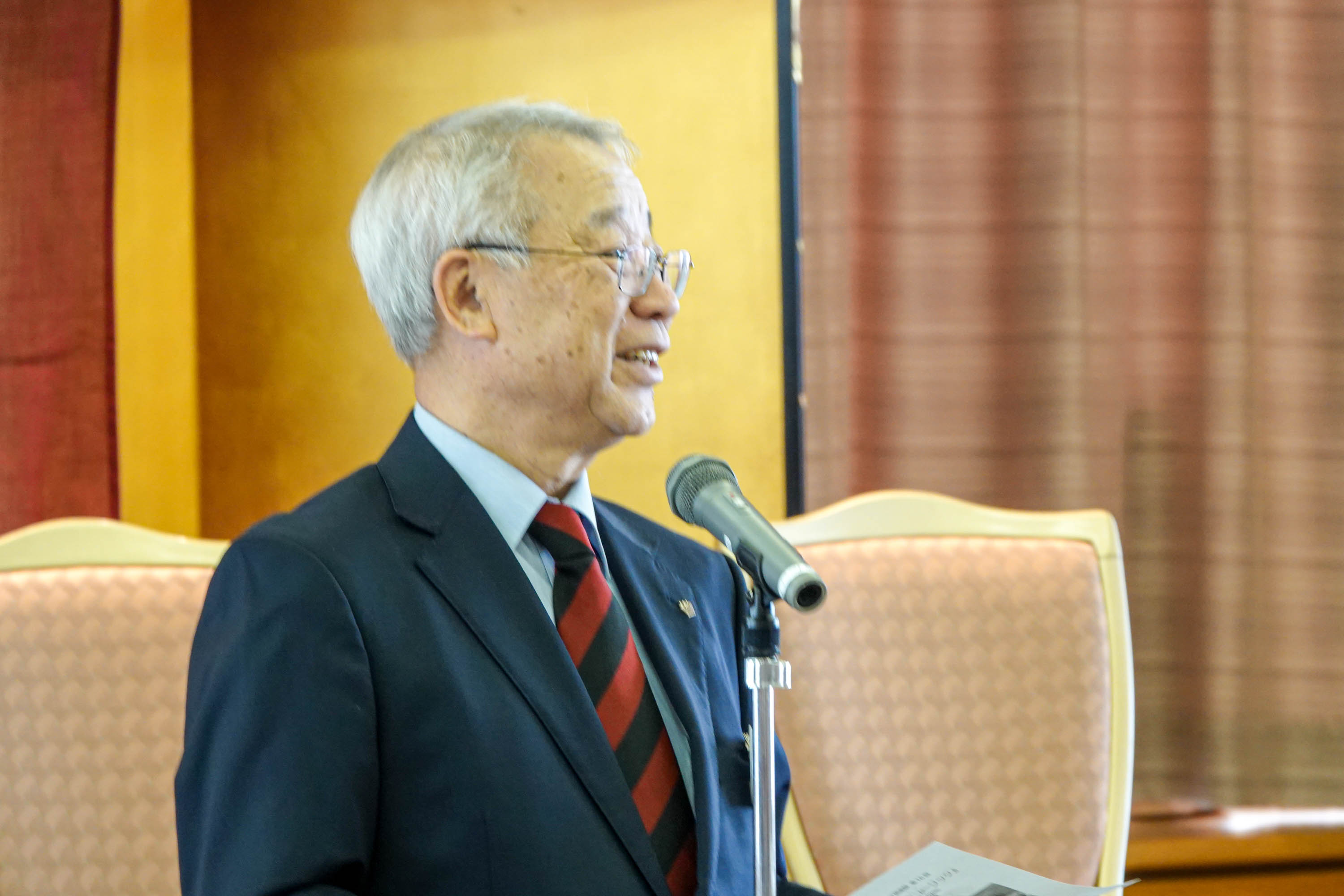 谷中常任幹事(2002 ・ 法)と松本恵美子常任幹事(2017 ・ 人間科学)が司会を務め、山中会長(1975・政経)の挨拶に続き、卒寿を迎えた4名の会員、山岸哲男さん(1958・政経)、星田正さん(1961・政経)、市川毅さん(1961・政経)、角田正三さん(1963・政経)の紹介と記念品贈呈が行われました。