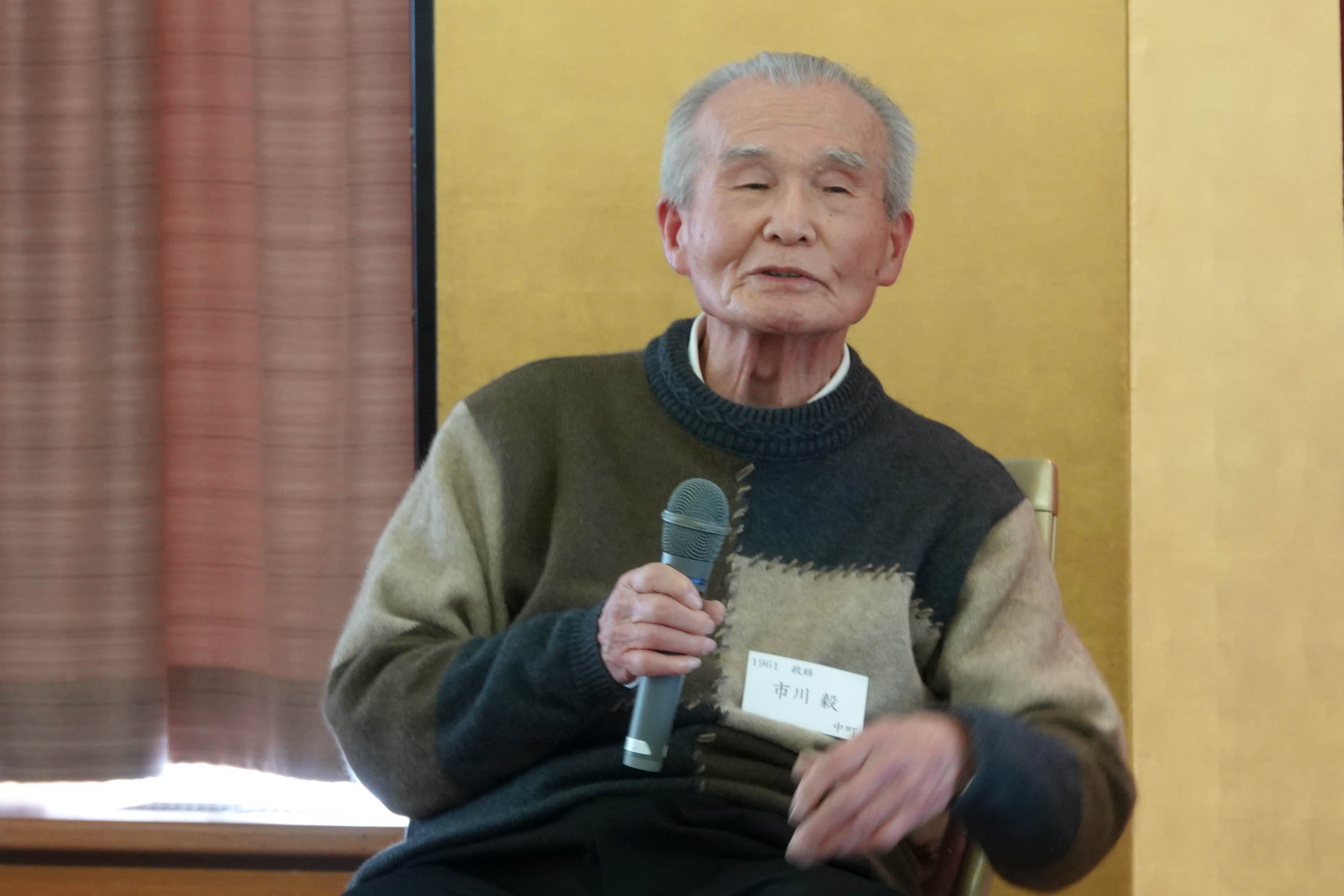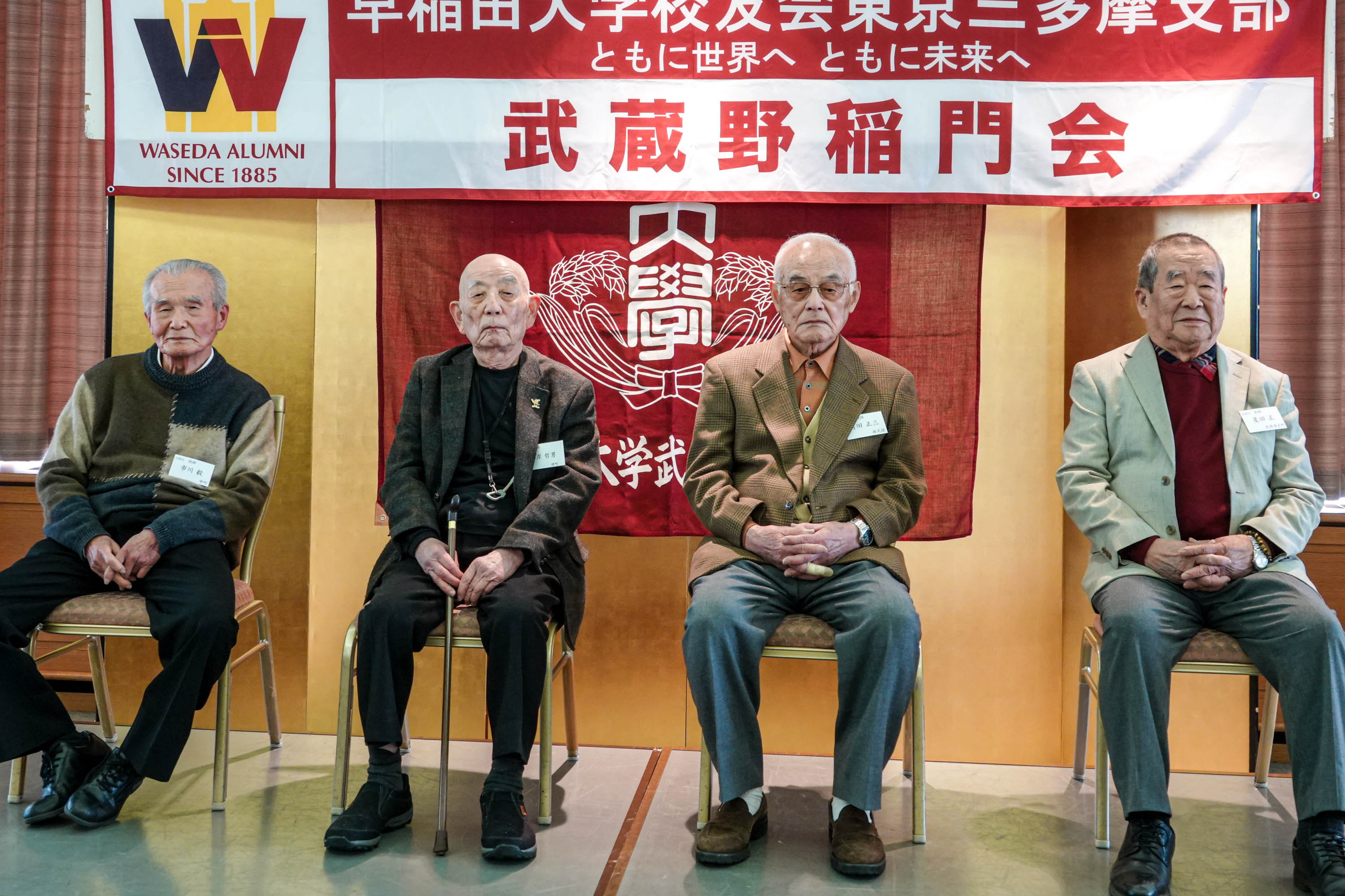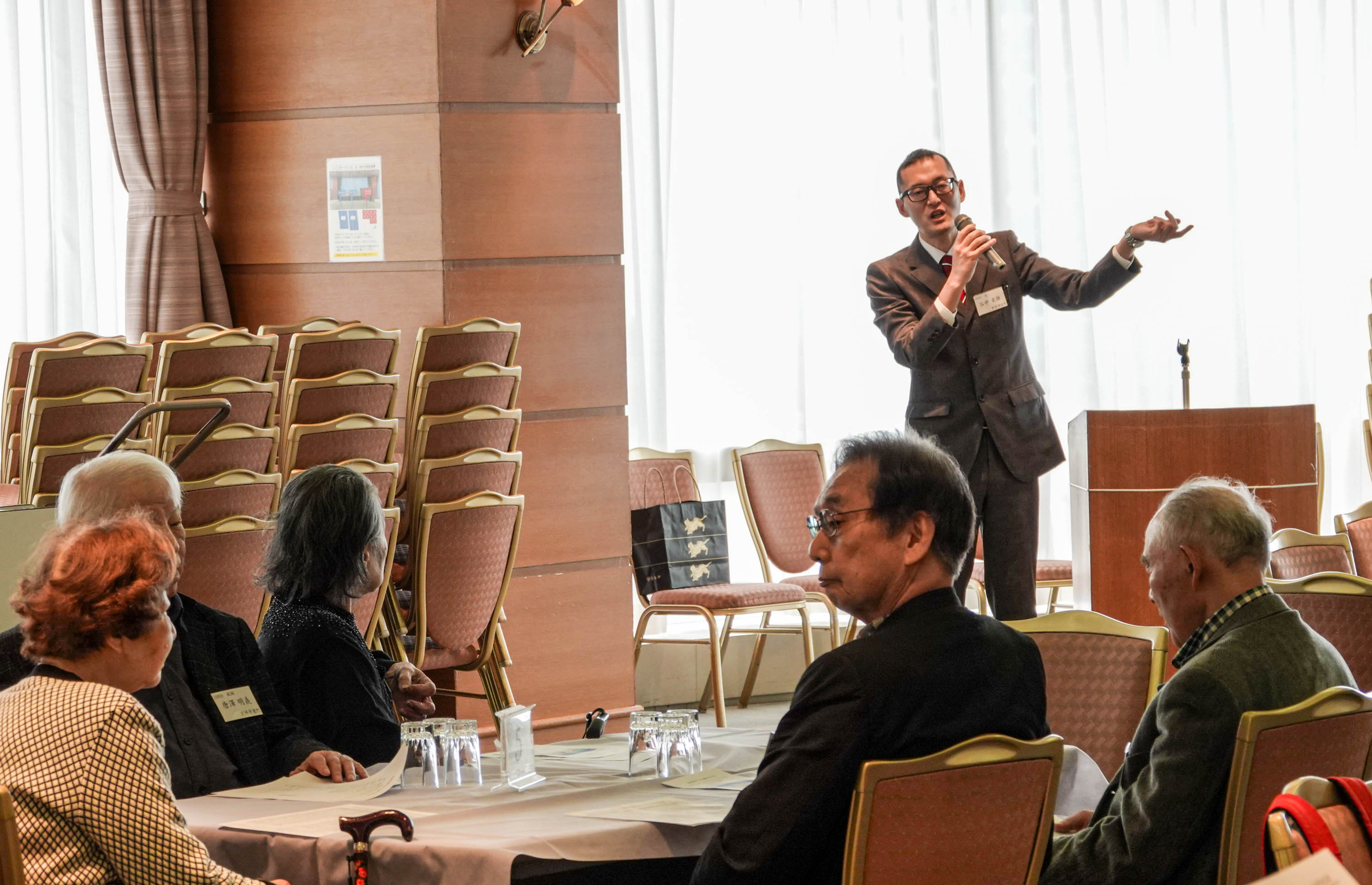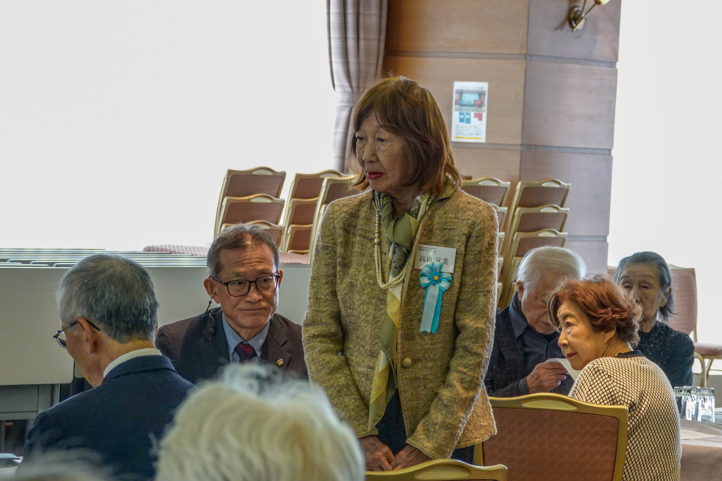 谷中常任幹事(2002 ・ 法)と松本恵美子常任幹事(2017 ・ 人間科学)が司会を務め、山中会長(1975・政経)の挨拶に続き、卒寿を迎えた4名の会員、山岸哲男さん(1958・政経)、星田正さん(1961・政経)、市川毅さん(1961・政経)、角田正三さん(1963・政経)の紹介と記念品贈呈が行われました。