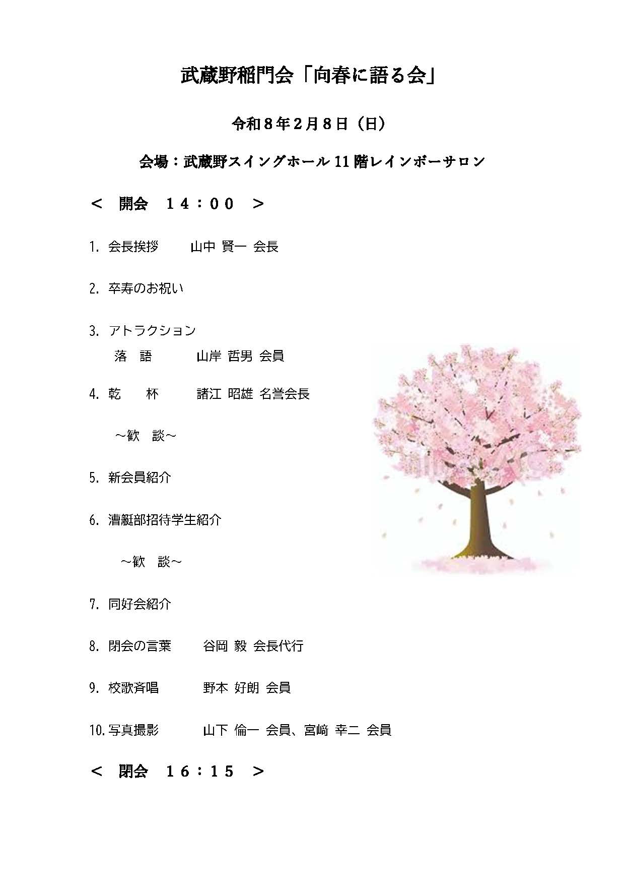 昨年より始めた、「向春に語る会」を2月8日(日)に開催しました。新しい季節を迎えるこの会には小雪降る寒い中にもかかわらず、59名(内会員52名)が参加し、和やかで充実した時間となりました。