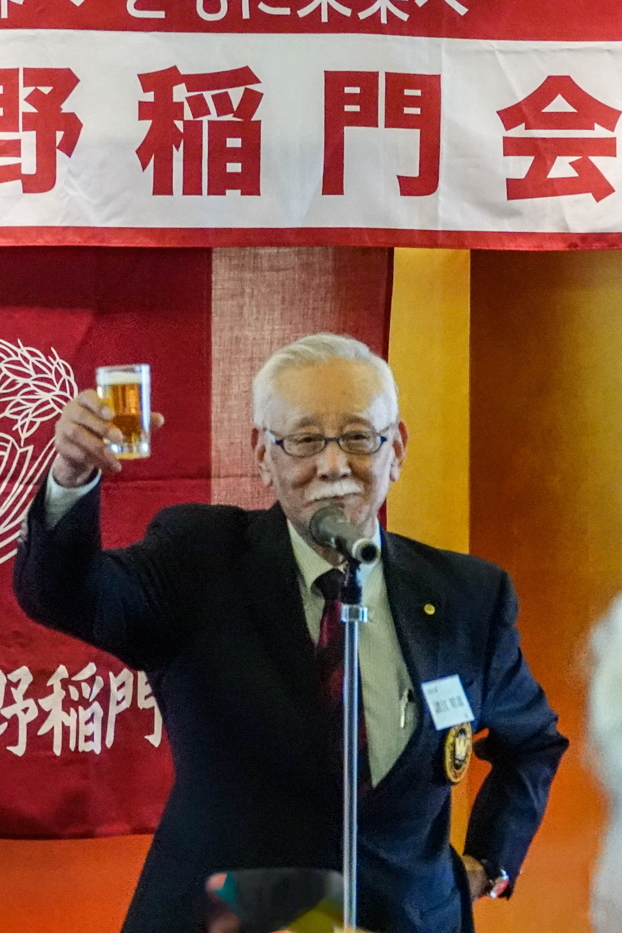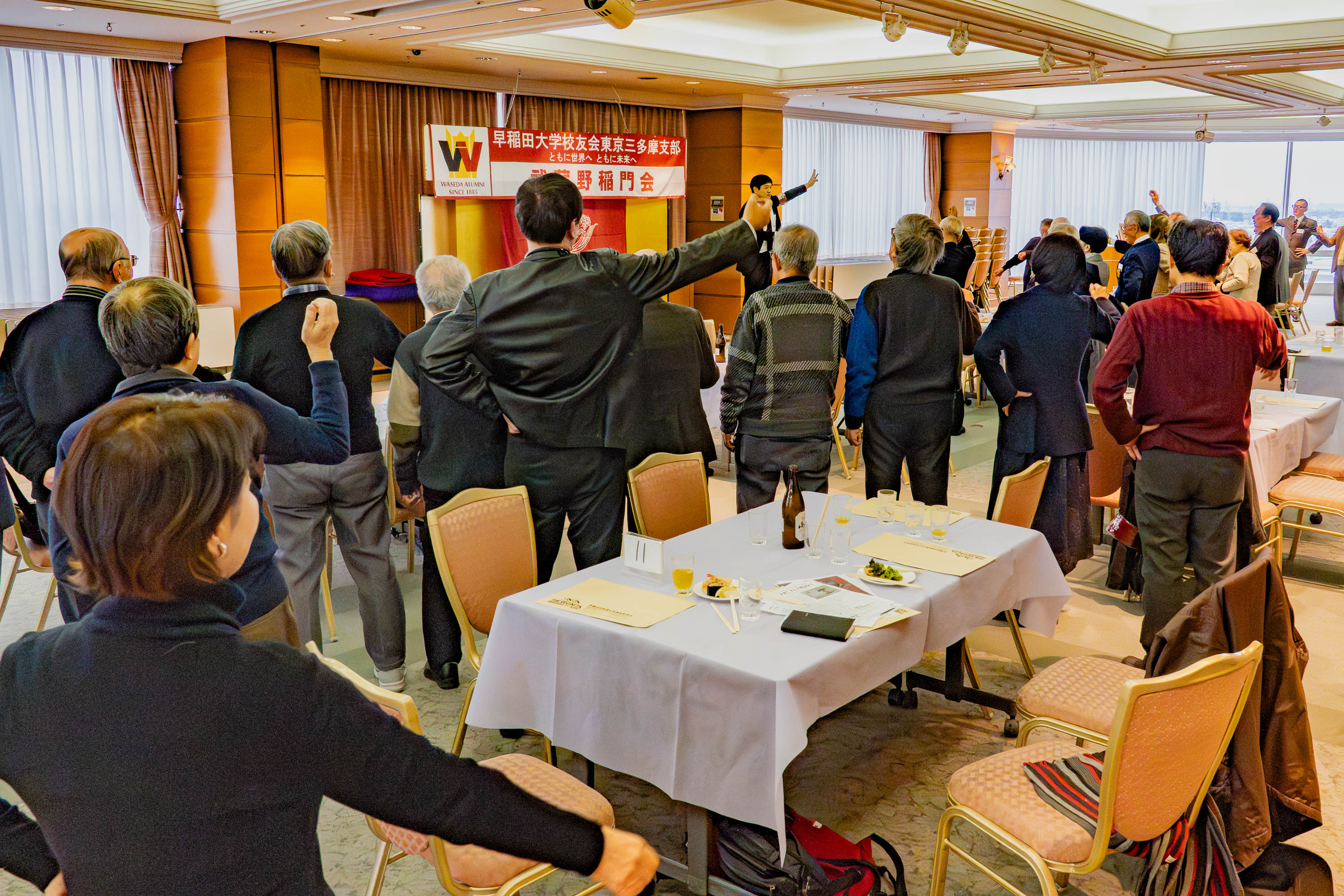 最後は谷岡(会長代行/1982・理工)の閉会の挨拶で締め、野本さん(2011・文)のリードによる「紺碧の空」と「都の西北」の斉唱で盛況の内に幕を閉じました。(記:谷岡)