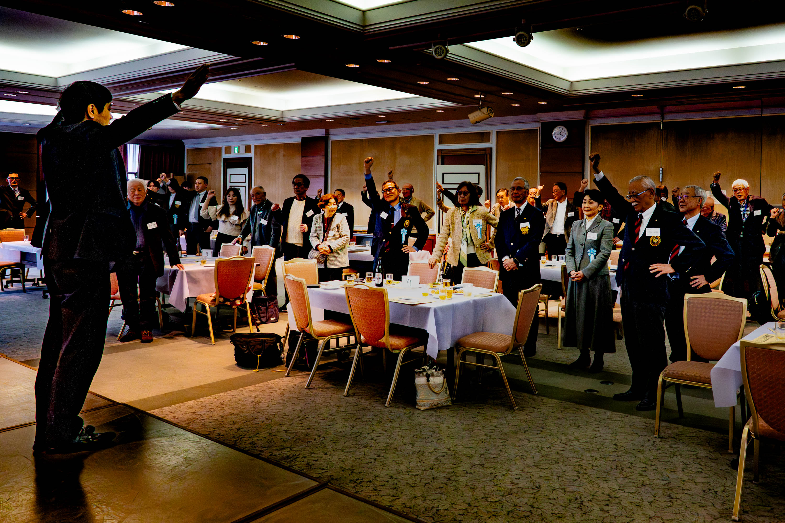 その後、諸江昭雄名誉会長(1963・法)の乾杯で宴が始まり、歓談の後、出席した2名の新入会員、砂川智広さん(1978・理工)、と昨年招待学生として向春に語る会に参加していただいた甲斐容子さん(2025人科修)の紹介と挨拶がありました。また、今年も漕艇部の稲門艇友会の西田会長と漕艇部の現役学生3名にお越しいただき、早慶レガッタの魅力を熱く語っていただきました