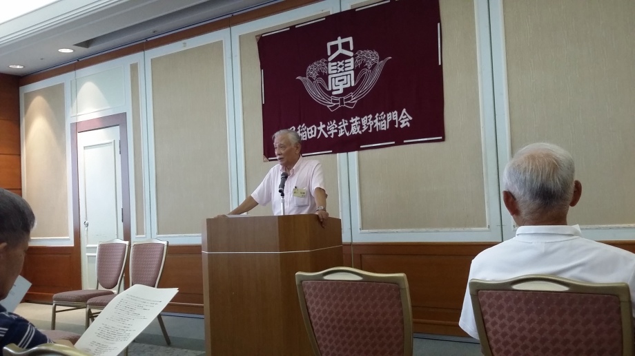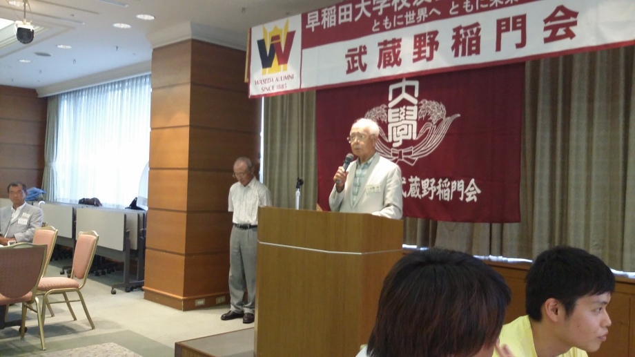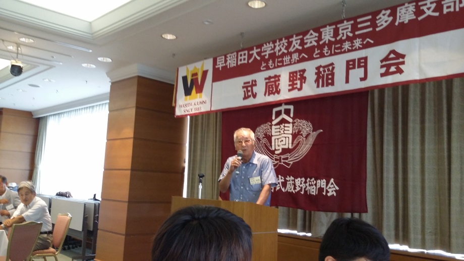 近隣稲門会からご出席いただいた方々『東村山稲門会から大内一男さま、稲酔会(立川稲門会)から鴛海量良さま、上野竜造さま、堤清さま、長野長正さま、近藤淳一さま』のご紹介。