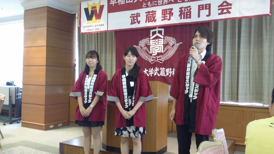 続いて、片岡会長代行から「えんじの会」の紹介と早稲田祭スタッフ代表の佐野良輔さん、校友チームチーフ前田 眸さん、細見華子さんの紹介。はっぴを着て、早稲田祭をアピール。