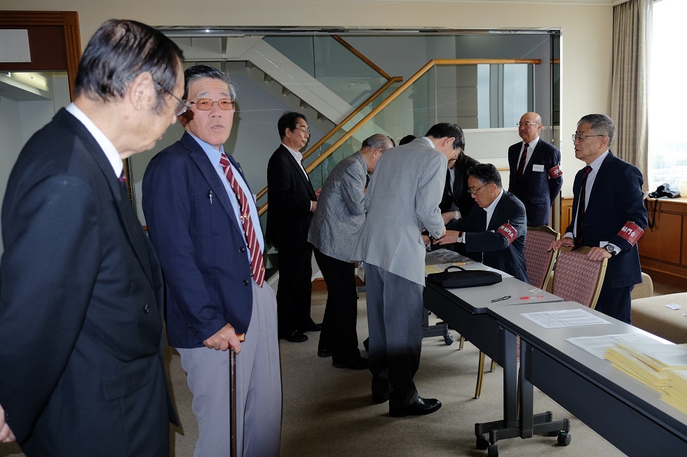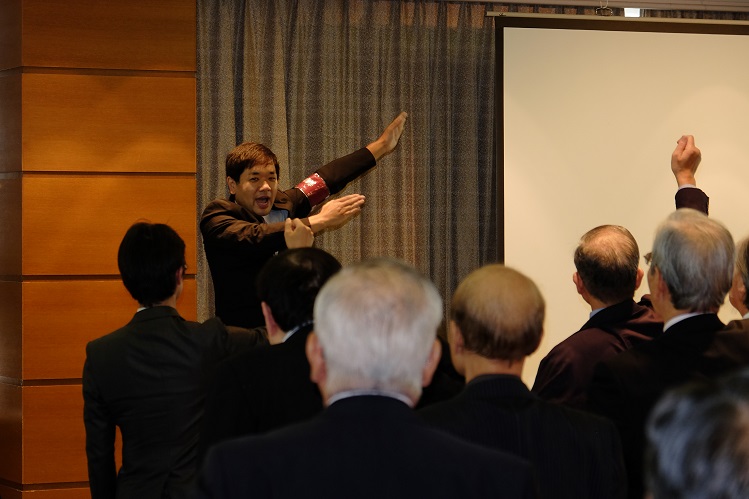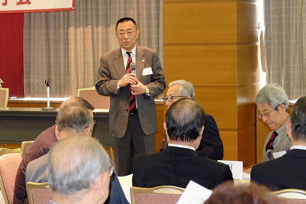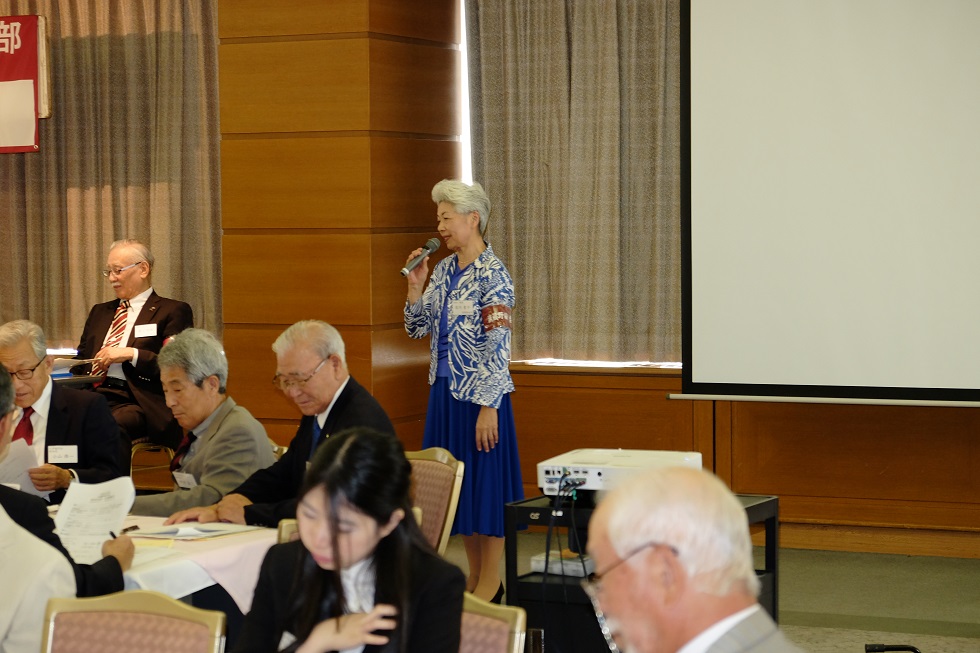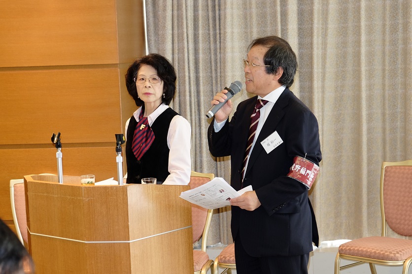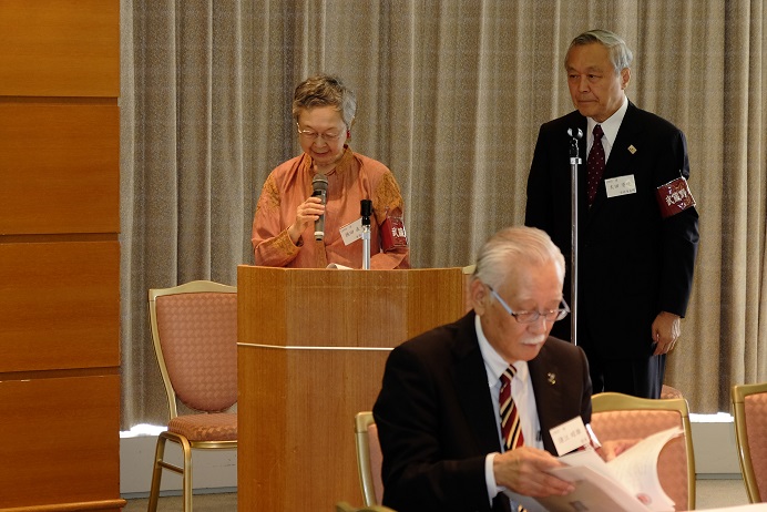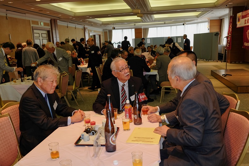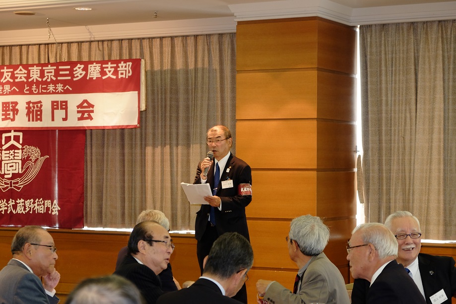 会は、太田資暁(1965商)常任幹事、徳田直子(1969法)常任幹事の司会で始まった。まず、亡くなられた会員への黙禱に始まり、諸江昭雄(1963法)会長の挨拶、鈴庄一喜早稲田大学常任理事の挨拶の後、総会の議事、来賓紹介、新会員、学生の紹介と滞りなく第一部は終了。