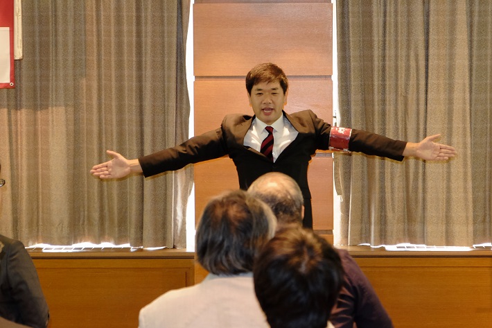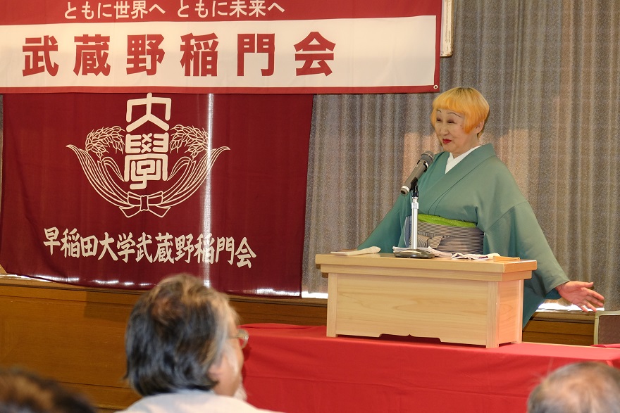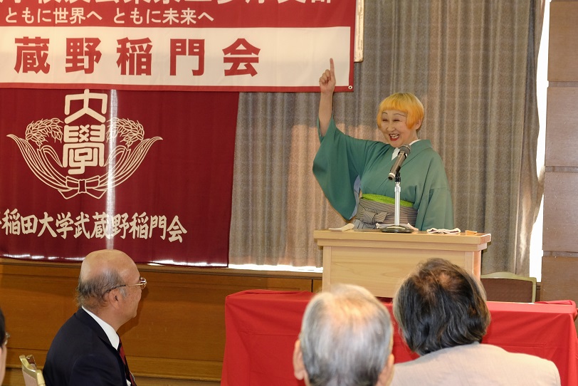 第2部の講演は、女流講談師の田辺鶴瑛氏で、演題は、早稲田卒で1級建築士だった義父を介護した経験を題材にした「介護から学ぶピンピンコロリでいく講談」。認知症になった義父とのやり取り、時に馬のかぶり物を被ってびっくりさせたり、早慶戦を聴かせると認知症の義父がベッドで寝ながら「都の西北」を必死に手を振りながら3番まで歌うとの話には、一同感動。