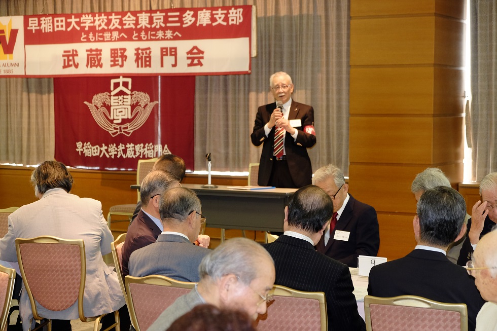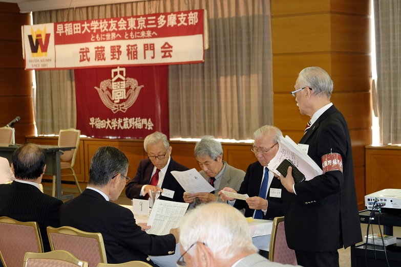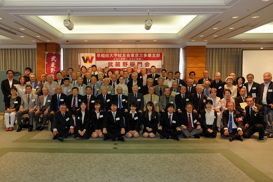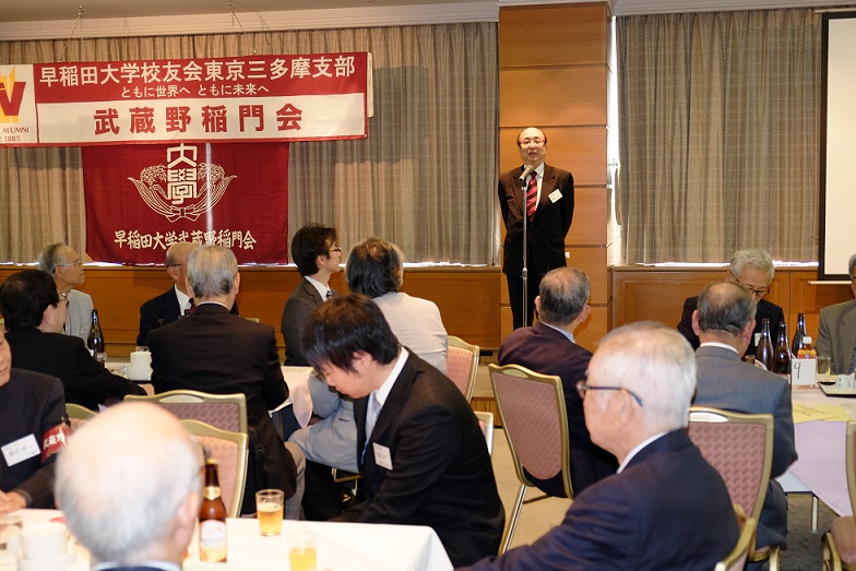 出席者数:来賓は、大学の常任理事の鈴庄一喜氏と地域コーディネーターで大学総合研究センター事務長の服部令氏など、小金井その他近隣稲門会の他に武蔵野三田会、明治大学校友会武蔵野地域支部の計22名、武蔵野市在住学生含む学生7名、講演者1名、会員の出席者数61名、総勢91名である。
