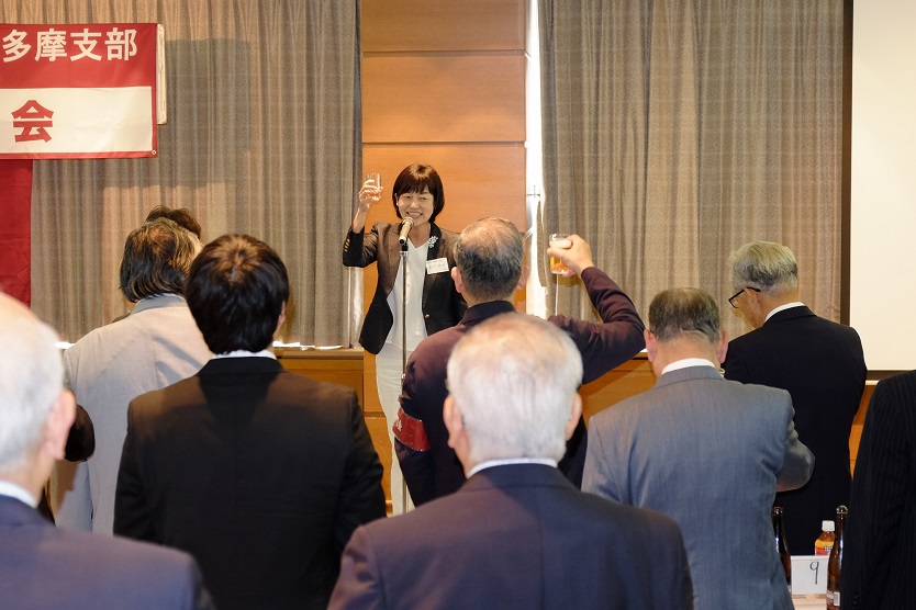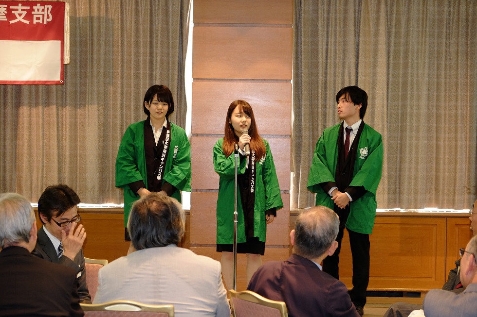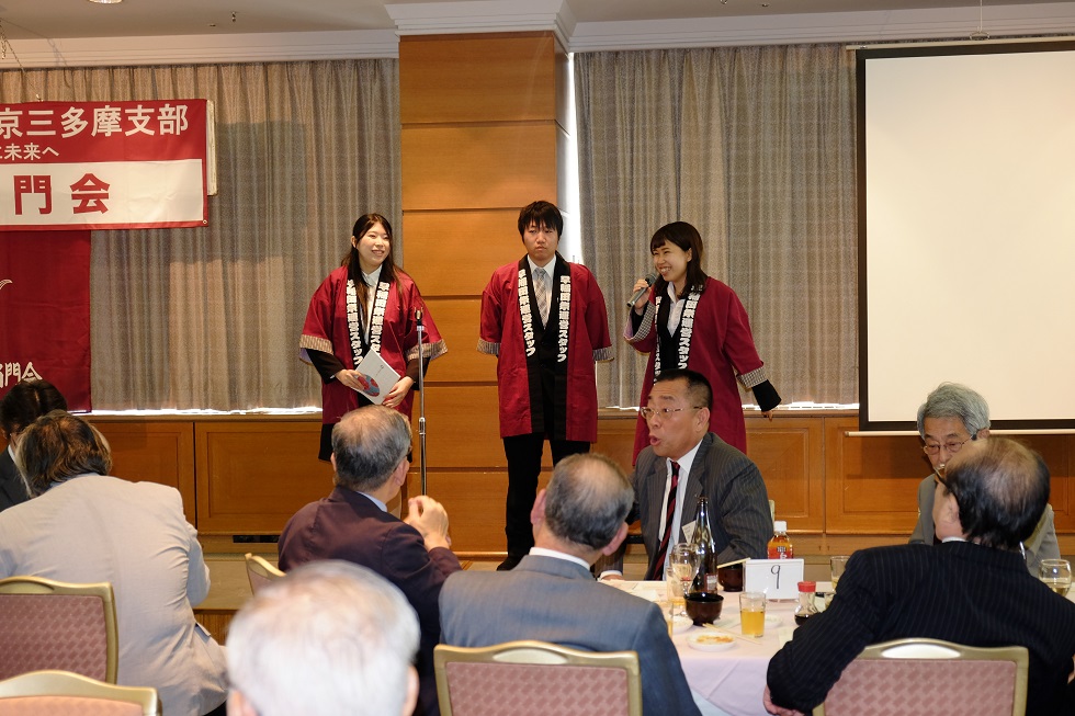 第3部の懇親会は、堀裕一(1980法)常任幹事と福田晴美(1972文)常任幹事の司会、最初に近隣稲門会来賓を代表して清水元国分寺会長が挨拶、次に会員の松下玲子(2004経研)武蔵野市長の乾杯で、懇親会がスタート、招待学生に出身高校を含めて一言挨拶して貰い、同好会世話人による現況報告等行い、最後は山口光朗(1970政経)事業担当の常任幹事が閉会の挨拶をし、野本好朗(2011文)常任幹事のリードで校歌を斉唱して閉会した。 (田坂忠俊 記)