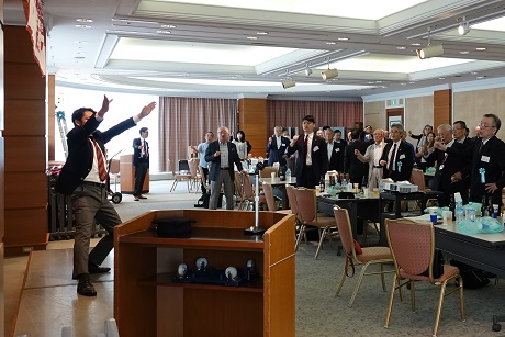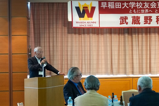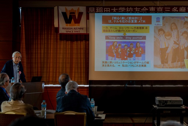 次いで、梅津光生氏(1974・理工、早稲田大学名誉教授・武蔵野稲門会員)の講演「明るく楽しく前向きに挑戦中:厚生労働省から国土交通省へ」です。 梅津氏は、医用機械工学研究の第一人者です。医療と工学をめぐる現状を分かり易く講演されました。一同、興味深く拝聴しました。