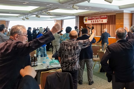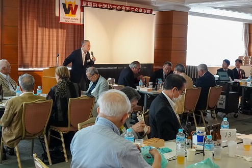 冒頭、逝去された会員の方々への黙禱。諸江昭雄会長より挨拶。早稲田大学を代表して、菊池馨実(ルビ:よしみ)氏(早稲田大学理事)より挨拶を頂きました。 令和4年度の活動報告・同決算報告・同監査報告が承認。会長選出となり、諸江昭雄会長が再任されました。令和5年度の活動計画案・予算案を審議。 諸江会長より、新役員体制の選出、新役員の紹介、退任役員への慰労の言葉がありました。
