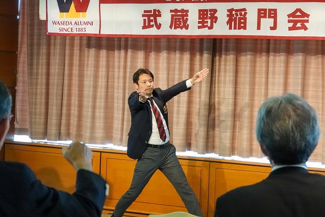 第2部懇親会です。乾杯の音頭は、下山登国分寺稲門会会長より頂きました。来賓を代表して、宿谷昌平氏(東京三多摩地区地域担当課長)が挨拶をされました。新会員紹介は、別府裕弘氏(1960・政経)です。参加者同士の懇談の後、笹山俊彦氏(1999・文、2002年度応援部主将)から、「角帽復活プロジェクトについて」、紹介がありました。一同、校友にとって楽しく大事なテーマに注目しました。歓談で賑わったところで、諸江会長より閉会の辞。最後に笹山俊彦氏の力強い指揮により校歌「都の西北」を、全員で斉唱、一同揃っての写真撮影、盛会の内での閉となりました。 (鈴木康之)