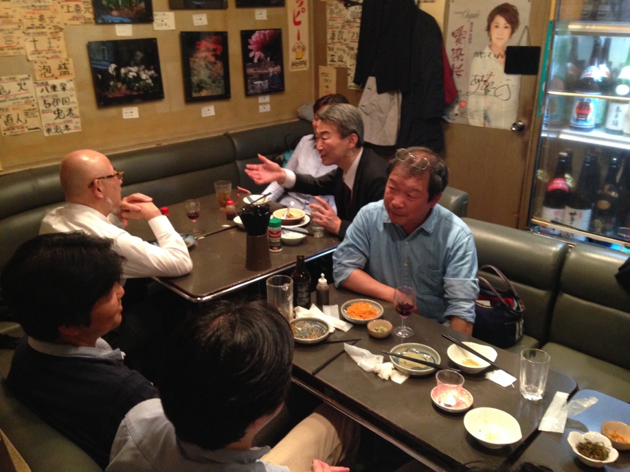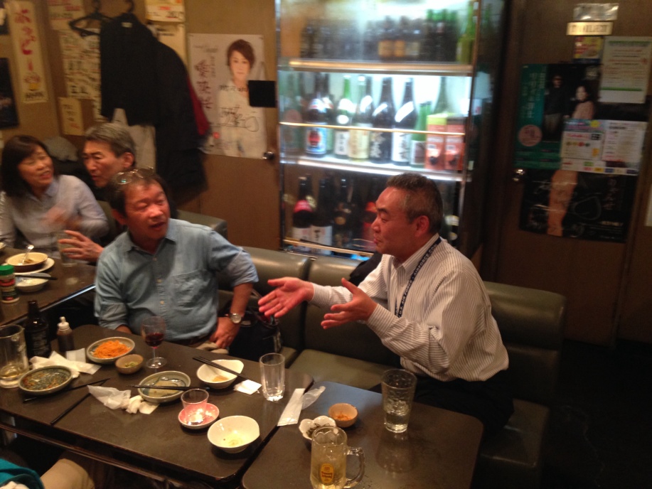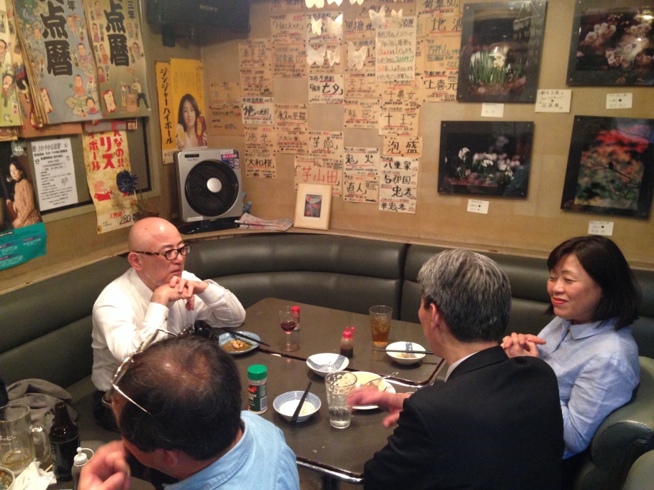 今回の若手の会はカヤシマにて開催されました。私が19時過ぎにお店に行くと、既に堀さん、飯野さん、海宝さんがおられました。初参加の海宝さんは日本の伝統工芸である飴細工の職人さんでもあり、貴重なお話を聞くことができました。その後、カヤシマの店主の佐藤さん、武蔵野稲門会の発足と運営に大きく尽力された大石さんが加わり、それから諸江さん、池田さん、菱田さん、小嶋さん、伊藤さん、広瀬さん、平野さん、根本さん、志村さん、吉崎さんが順次到着し、計16名が集合して大盛況となりました。初参加の小嶋さんは東急不動産に勤務されており、部下の方を二人(伊藤さん、広瀬さん)も連れて来てくれました。また、志あわせの店主の志村さんも今回は忙しい中かけつけてくれました。23時30分頃に最後まで残ったメンバーで記念撮影をし、散会となりましたが、今回も話題が仕事から育児、ゴルフ、介護にまでおよび、非常に内容の濃い楽しい会になりました。