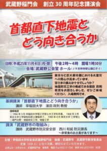 2013年11月4日(月・祭) 創立30周年記念講演会 会場:武蔵野公会堂 午後2時~4時 基調講演「首都直下地震とどう向き合うか」 講師 早稲田大学 濱田 政則 教授 午前中の雨模様にもかかわらず、200人近い […]