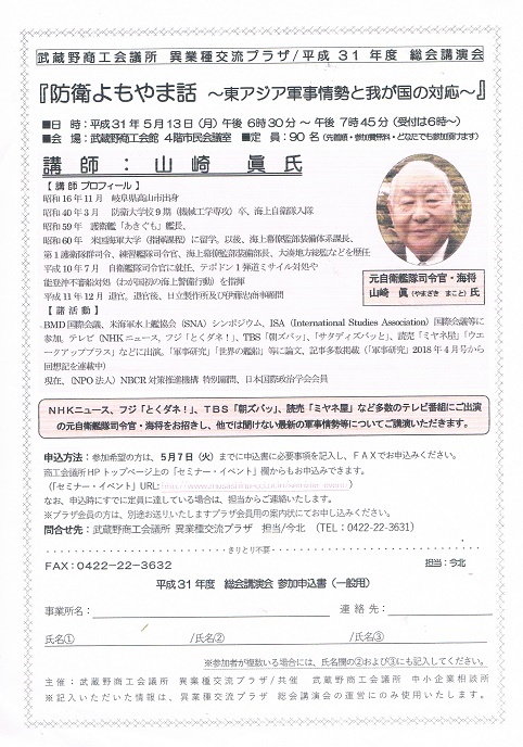 拝啓、お世話になります。5月13日、武蔵野商工会議所4階で6時30分から海上自衛隊元艦隊司令官、海将の山崎真氏を私がお呼びして、 敬具 「東アジア軍事情勢と我が国の対応」についてお話をいただきます。武蔵野稲門会でもお話しいただきたいと思っています。 是非ともお出かけくださいませ。添付をご覧くださいませ。迫力ある話が聞けます。当日直接おいでいただいても入場可能と思います。 また熊本城復興支援チャリテイコンサートもどうぞお出かけください。当日売りもあります。よろしくお願いいたします。 山本富士雄